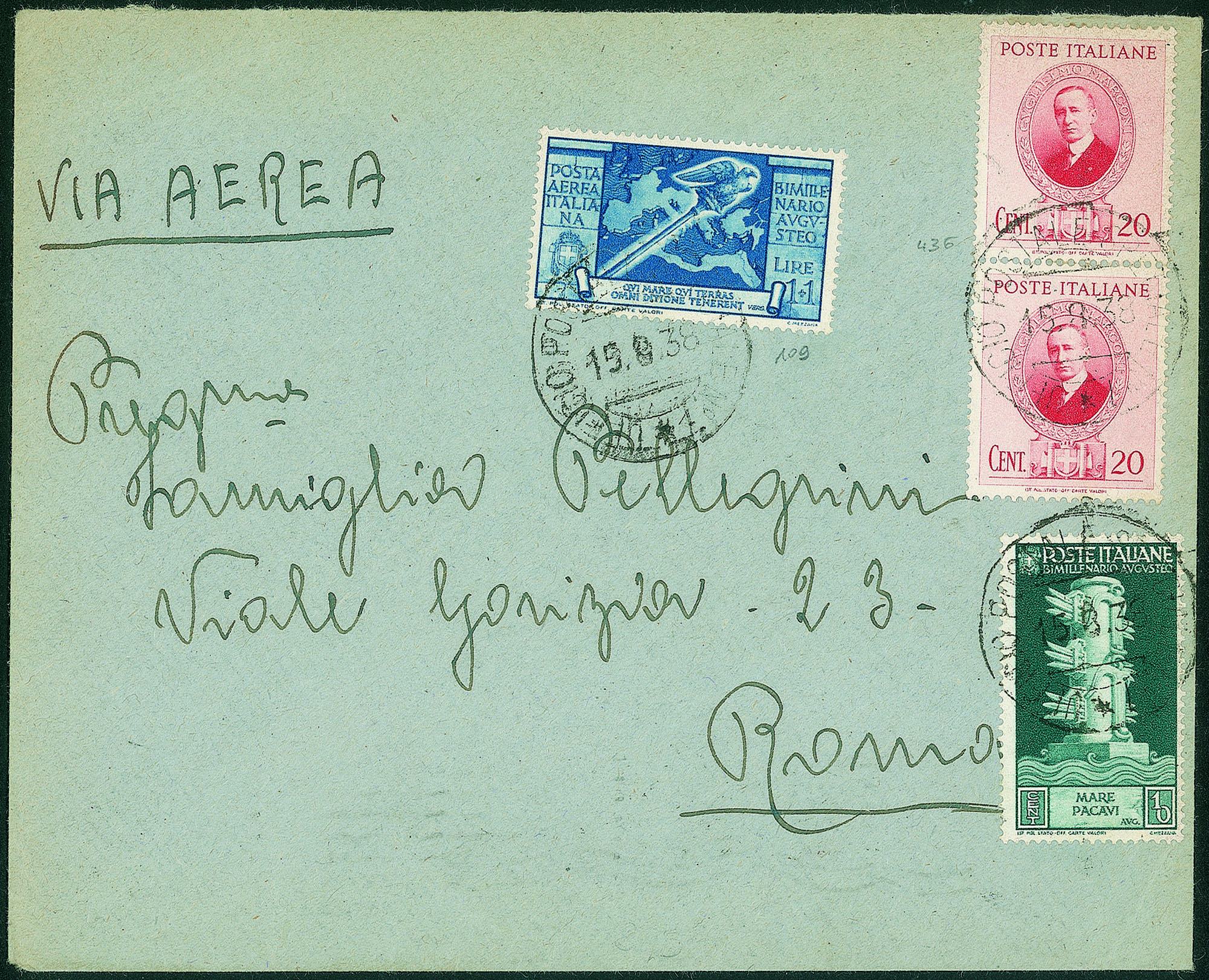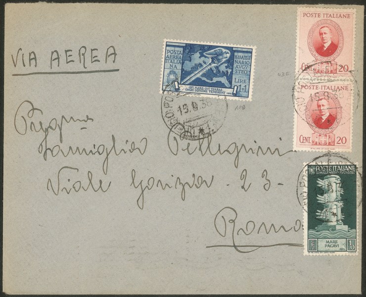 Augusto 10 cent + 1 + 1 lira Aerea (416 + 109) + Marconi 20 cent (due 436) su aerogramma per Roma del 15.8.38 - raro uso - molto bello