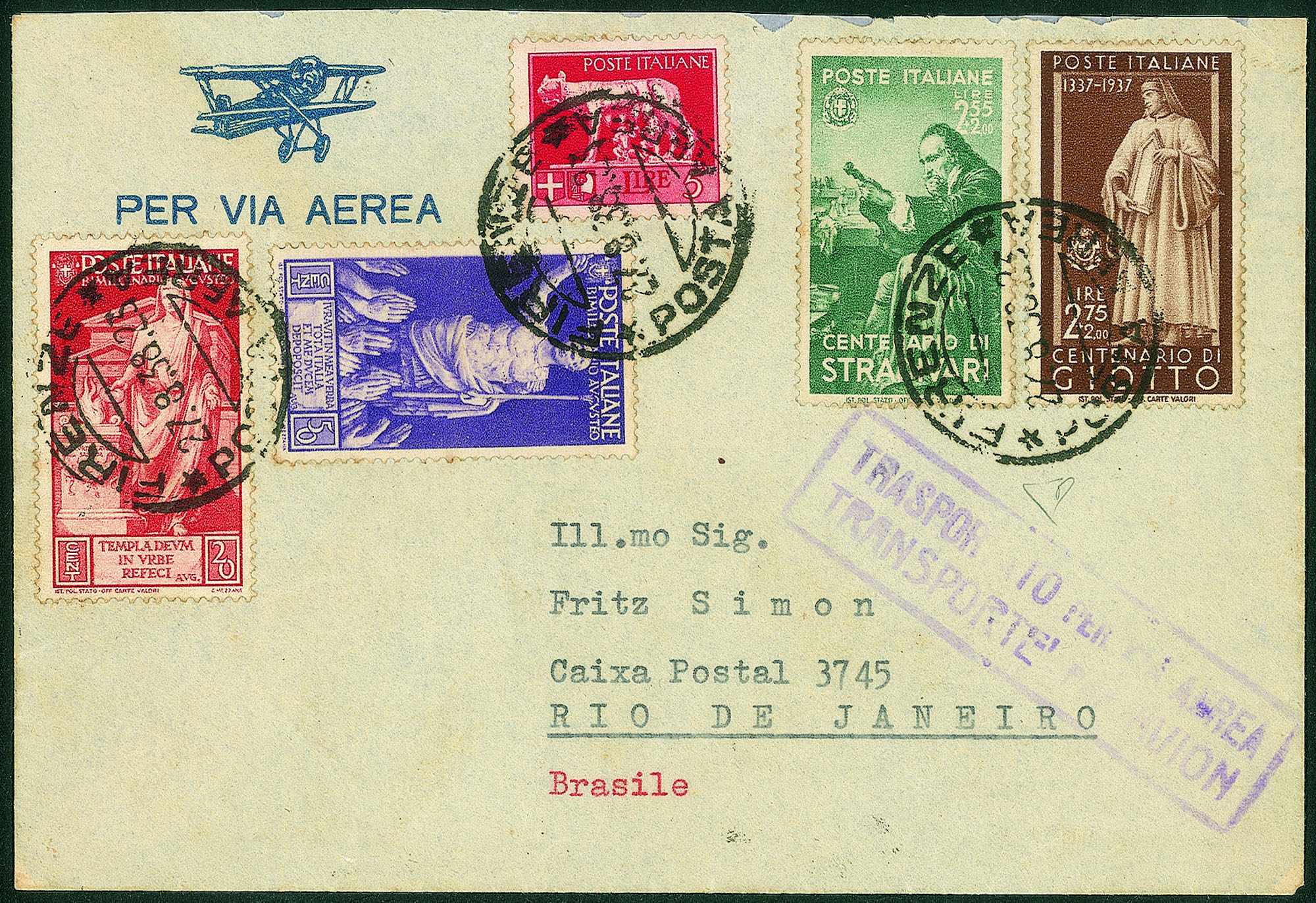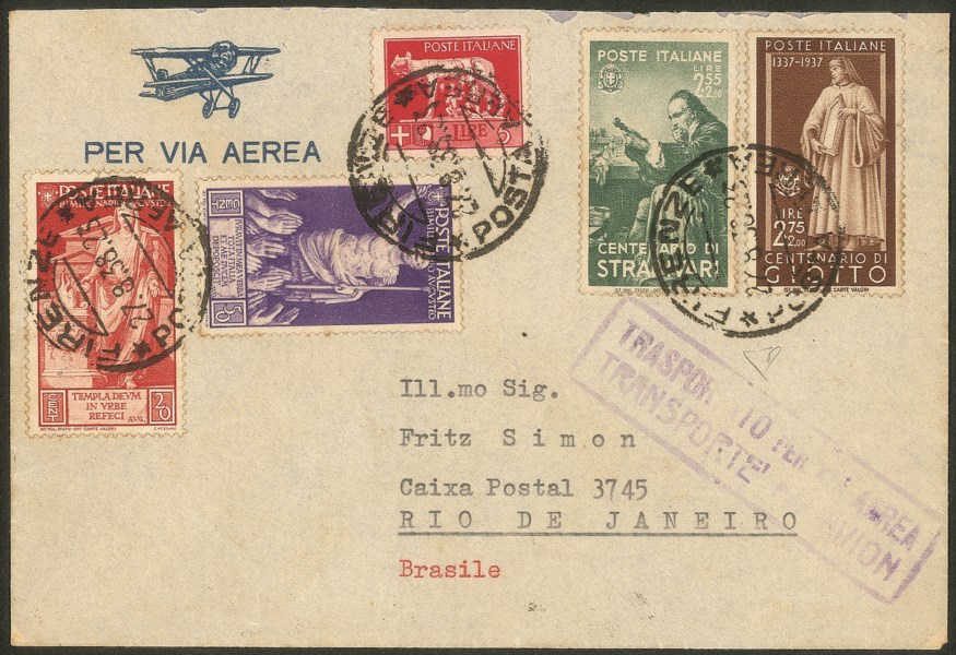 + Augusto (418 + 421) + complementare su aerogramma da Firenze a Rio de Janeiro del 27.8.38 - in tariffa - molto bello - Diena