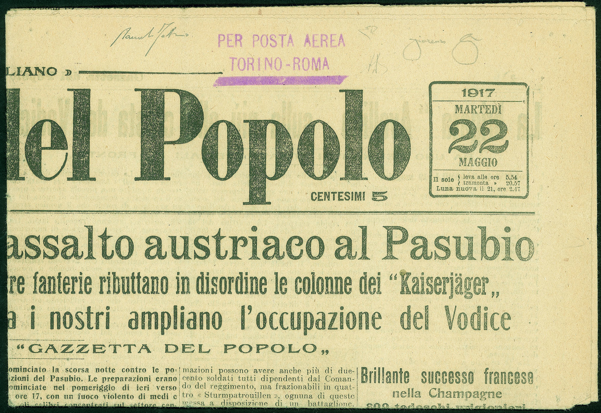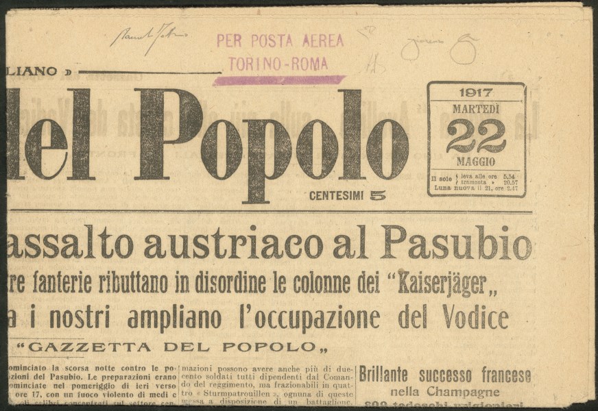 Timbro su giornale Gazzetta del Popolo (Longhi 817) - Intero giornale trasportato a bordo del velivolo Pomilio P.C.1 durante l'esperimento di andata Torino Roma - documento rarissimo in ottimo stato di conservazione - Cert. E.Diena + Cert. Longhi + Cert. oro Fabris