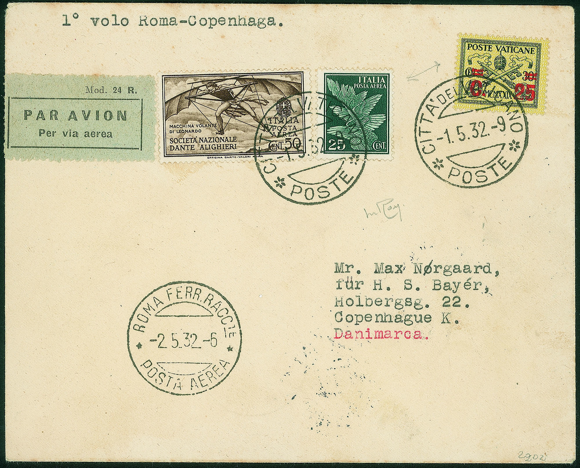 Regno - Vittorio Emanuele III - Posta Aerea e Aerogrammi - Primo Volo Roma Copenhagen 1.5.32 (Longhi 2631)