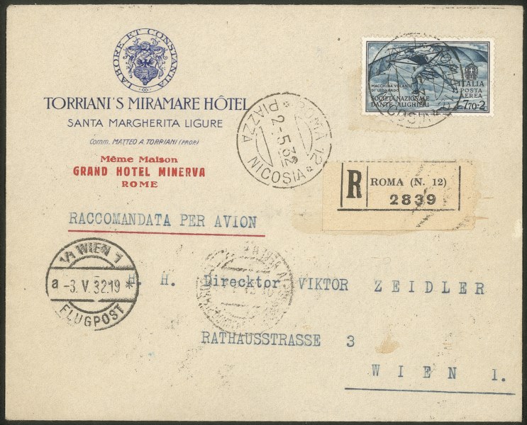 Isolato su aerogramma raccomandato da Roma a Vienna del 2.5.32 - splendido