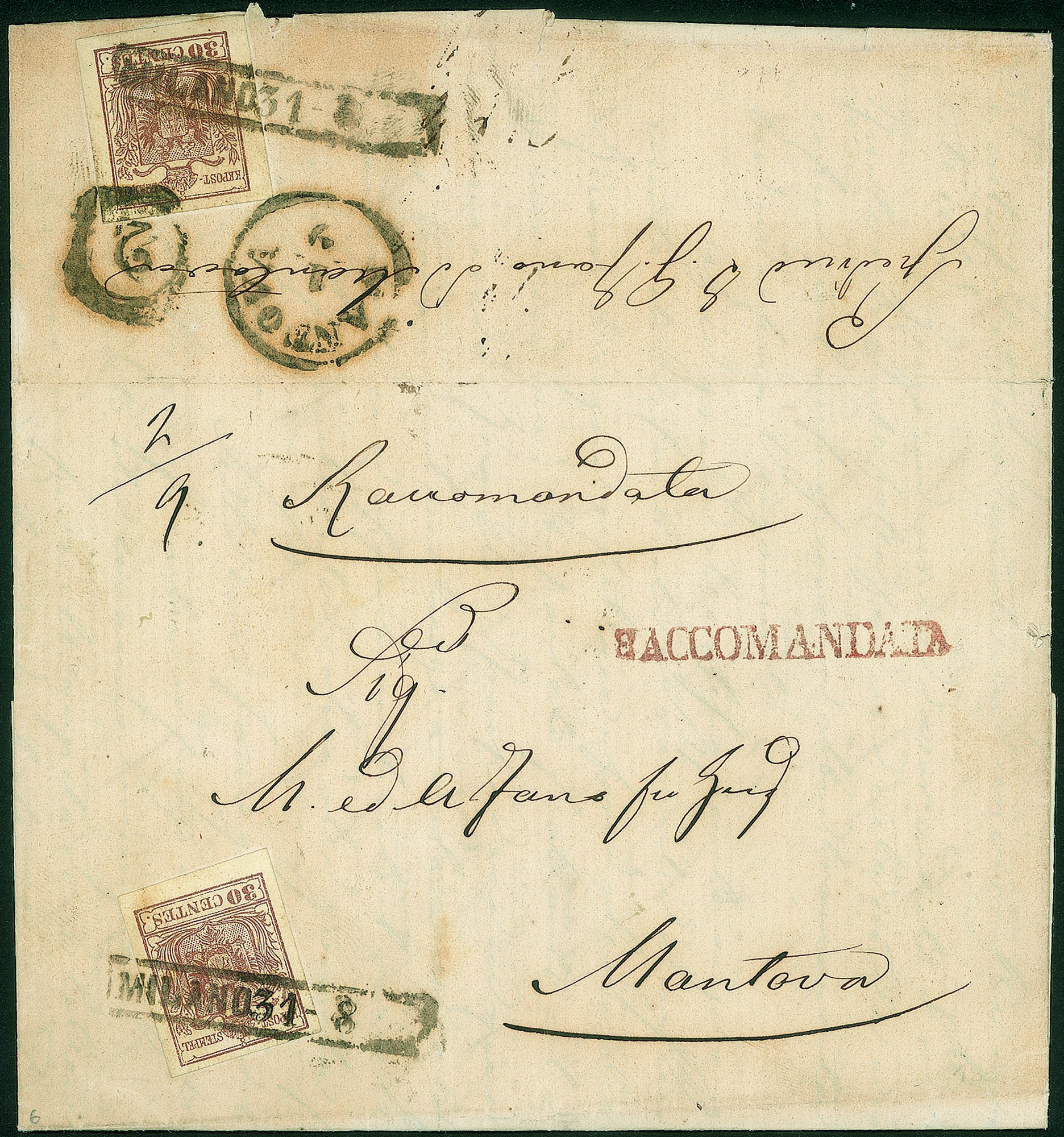 Lettera raccomandata del 31.8.1857 per Mantova affrancata con due 30 cent secondo tipo (9) sia sul recto che sul verso
