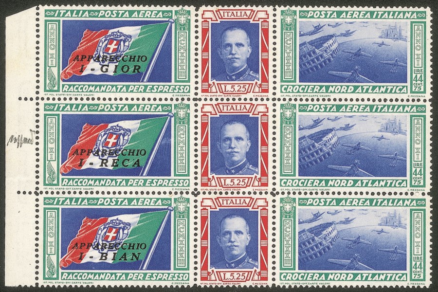Regno - Vittorio Emanuele III - Posta Aerea e Aerogrammi - 1933 - Bellissimo blocco di tre bordo di foglio dei Trittici I-GIOR/I-RECA/I-BIAN (51/52 B-g-q)