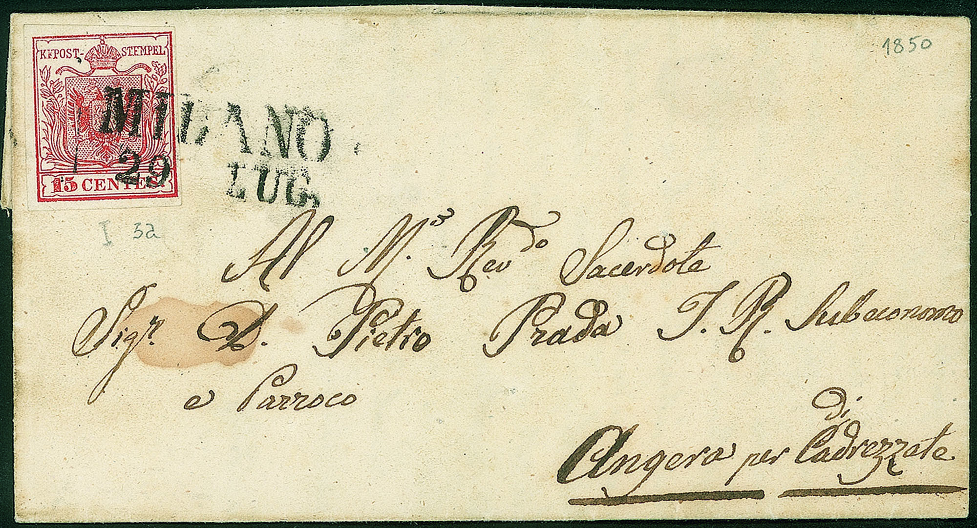 Lettera del 29.7.1850 affrancata con 15 cent primo tipo prima tiratura carta a mano (3a)