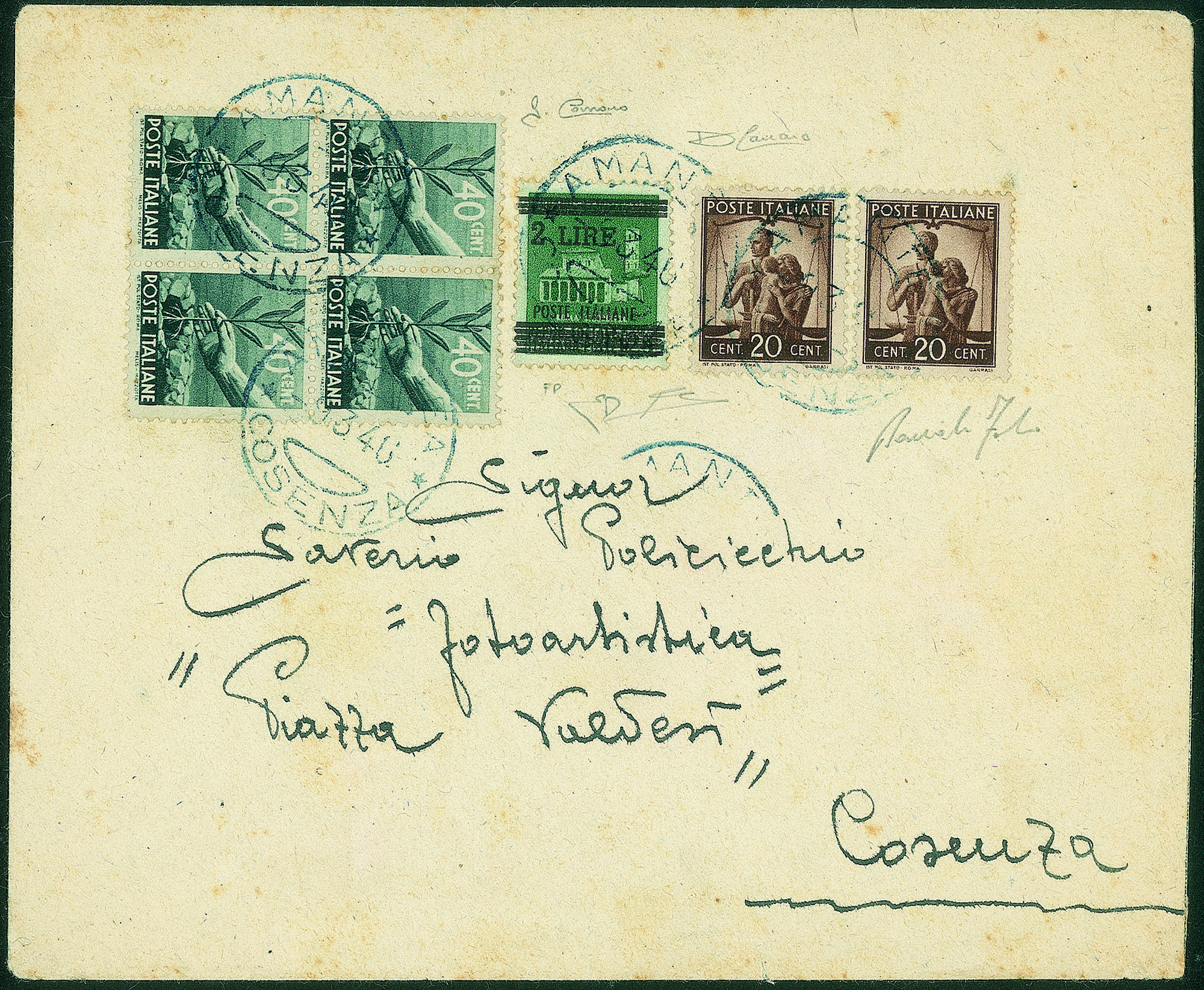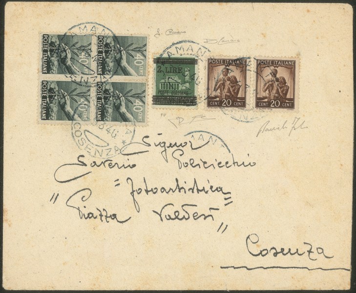 + complementari Democratica (due 544 + quattro 546) da Amantea a Cosenza del 9.3.46 - splendida bella e molto rara - Fabris + cert. Diena + cert. G. Carraro + cert. Carraro