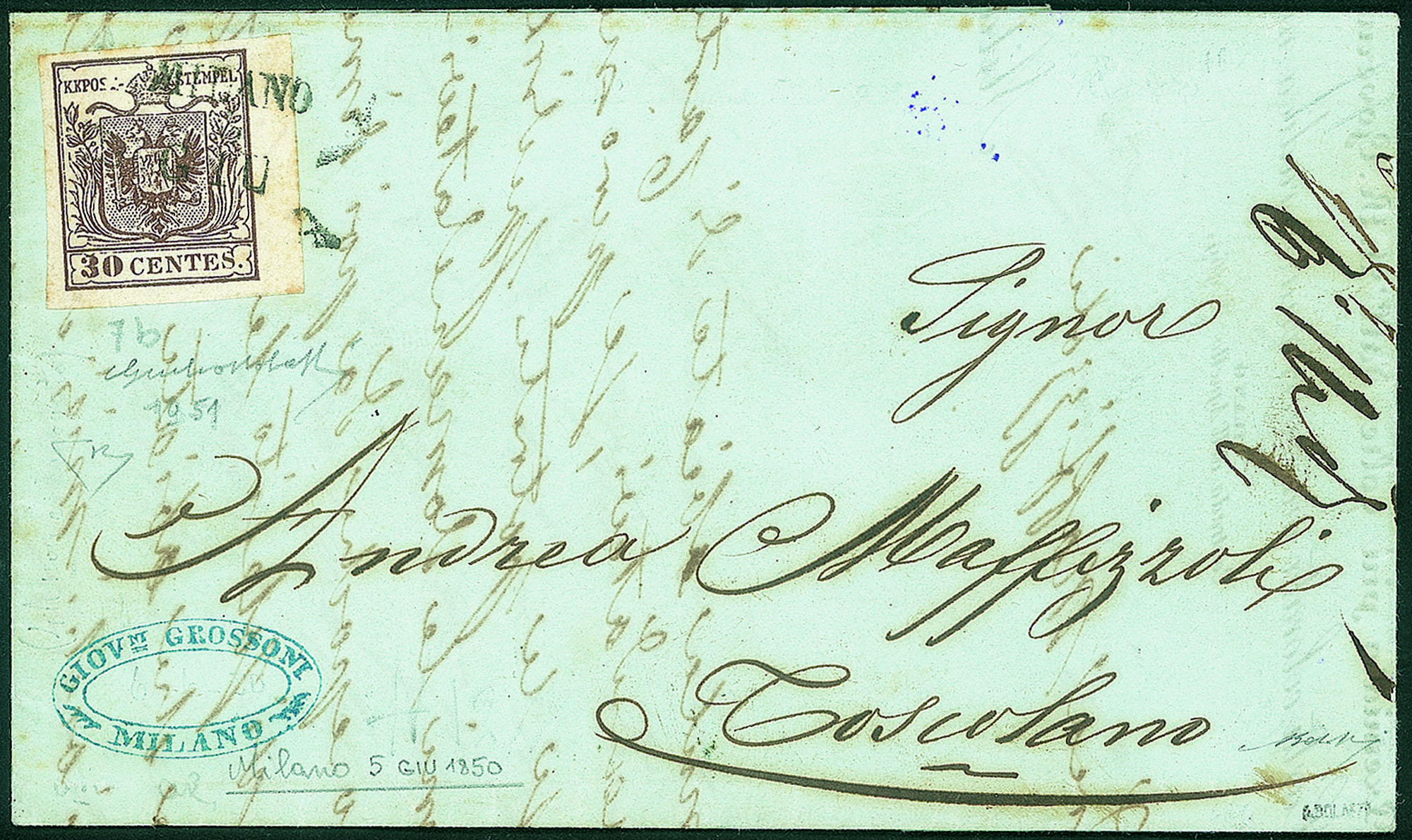 Lettera affrancata con 30 cent bruno (7) I tipo con bordo di foglio a destra per Toscolano del 5.6.50 (quinto giorno d'uso) - molto bella - Giulio Bolaffi + cert. E. Diena