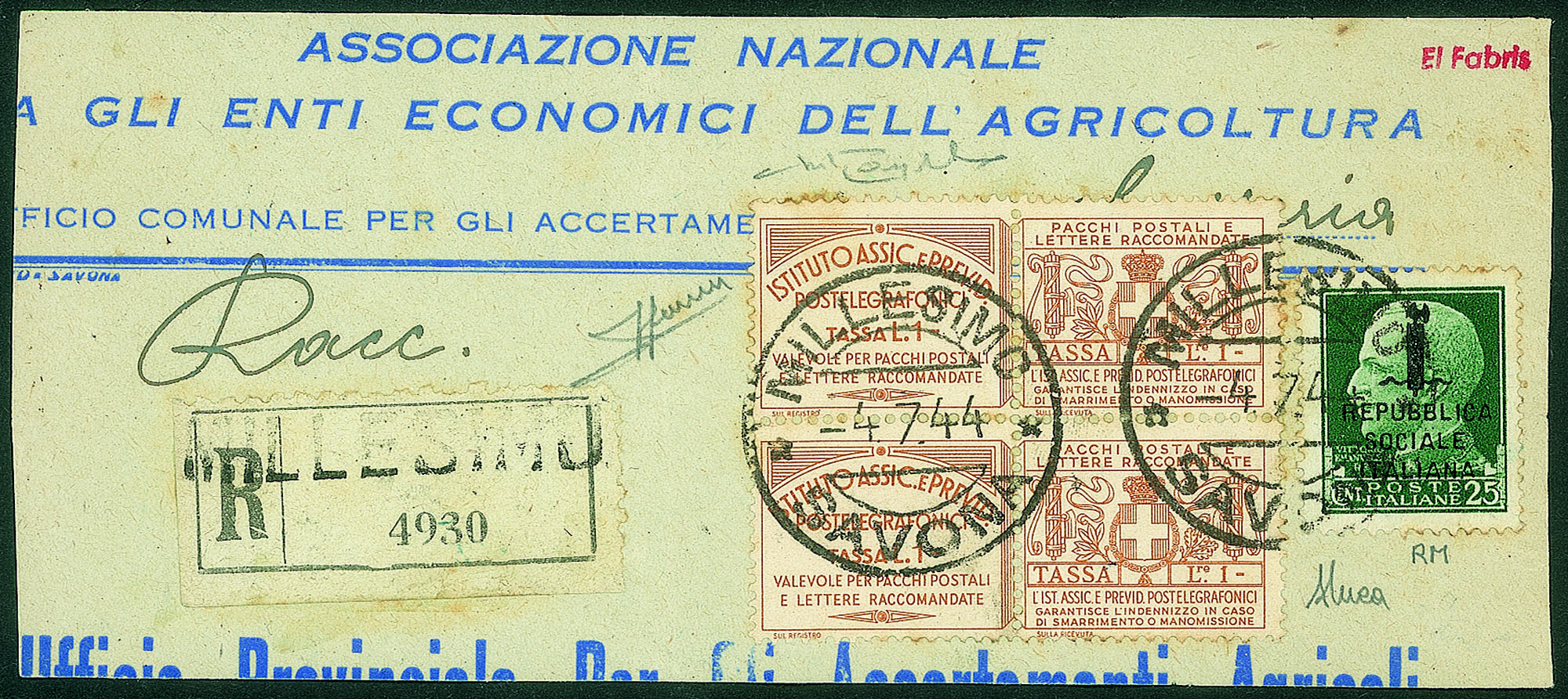 Repubblica Sociale - Provvisori - Grande frammento di raccomandata in affrancatura d'emergenza composta da 25 cent (491)
