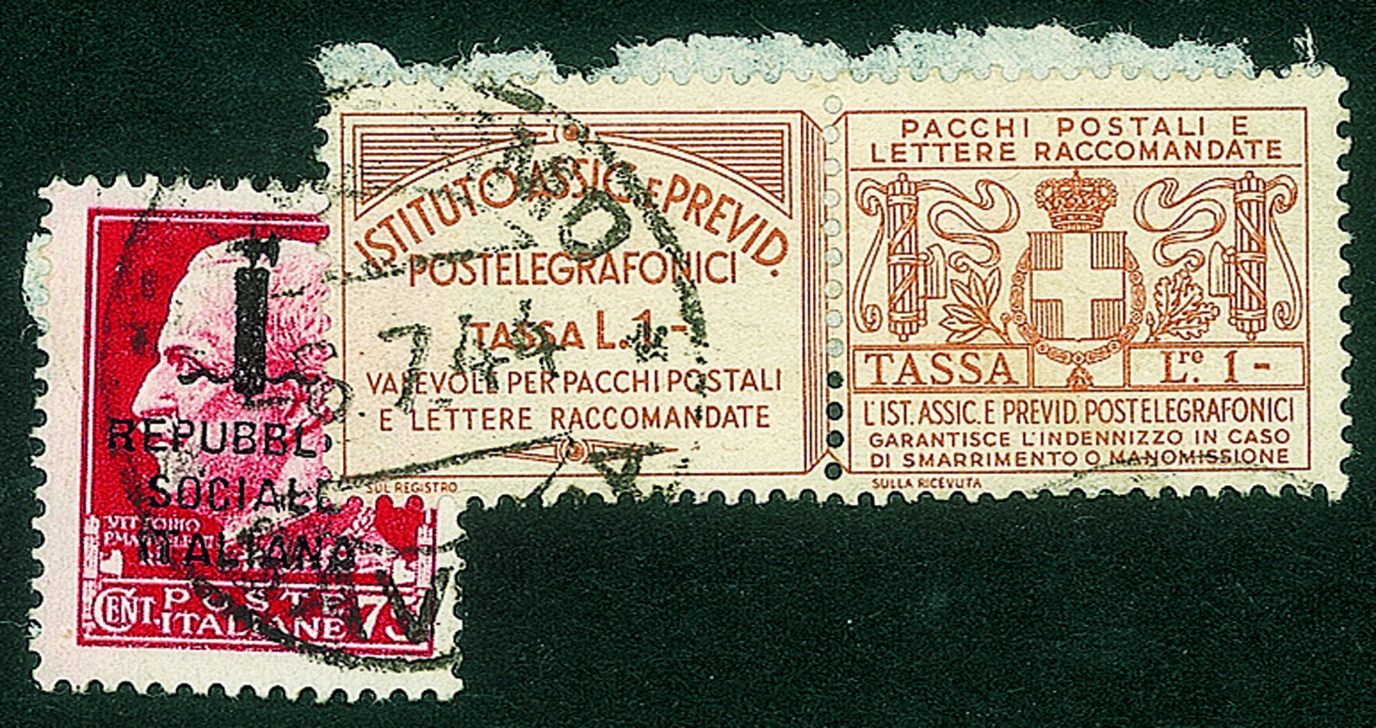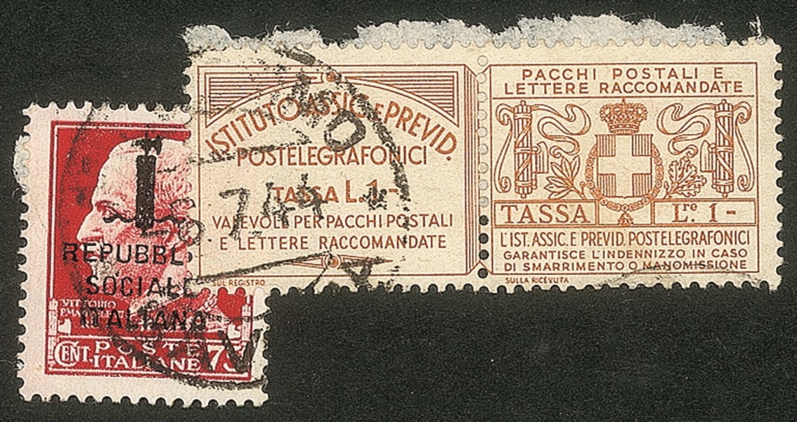 + Francobollo Assicurativo da 1 lira (13) - Millesimo (Savona) 6.7.44 - uno dei due casi usati citati dal Sassone - molto raro - cert. Andreoni + cert. oro Raybaudi