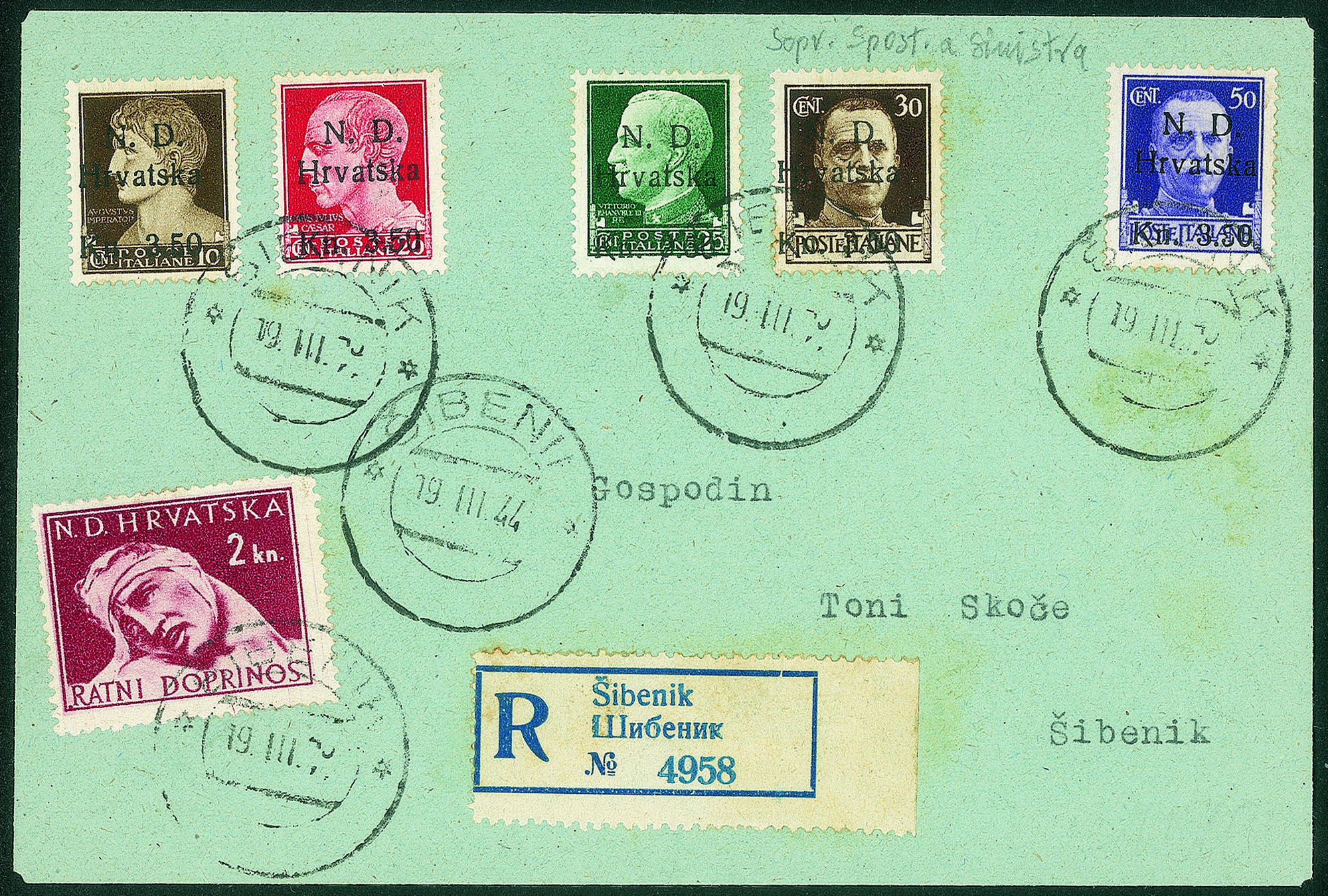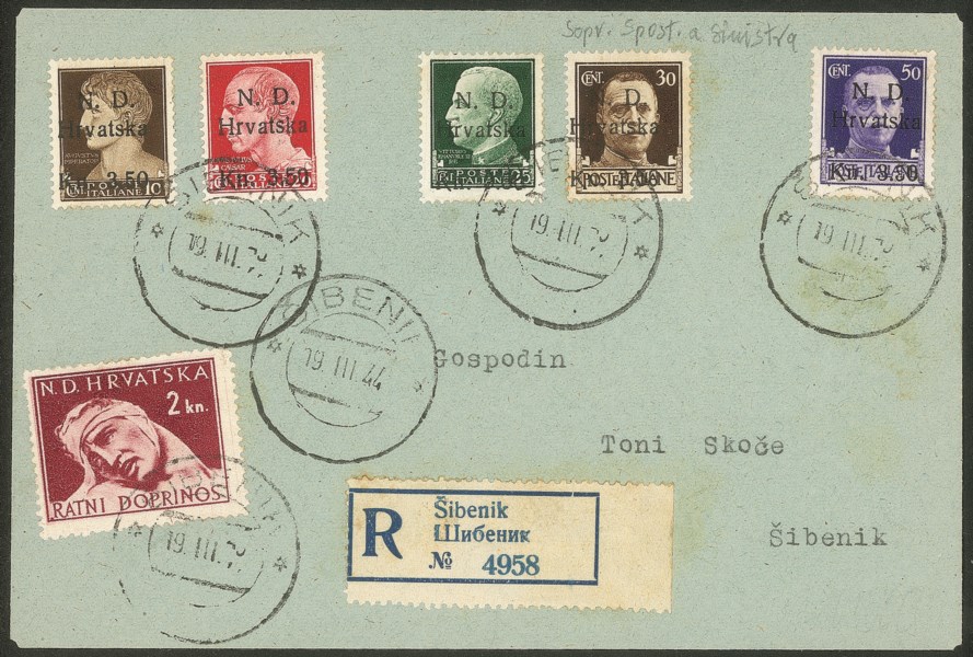 + Valore Croato da 2 kn su busta raccomandata per città - Sebenico 19.3.44 - non comune