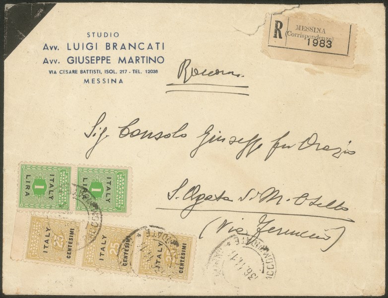 Su raccomandata da Messina a S. Agata Militello del 13.6.44 - in tariffa