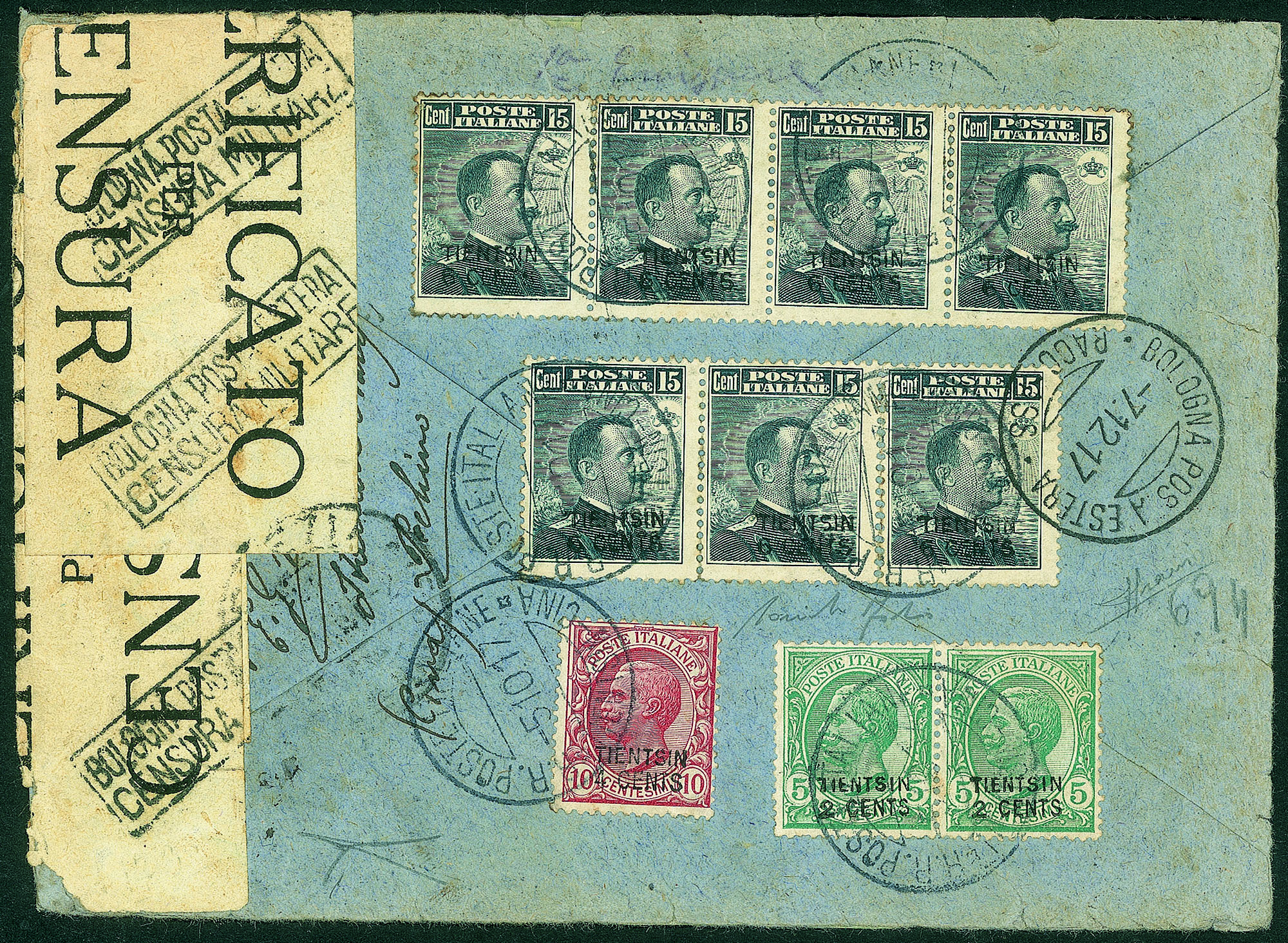 Per un totale di 50 cent da Tientsin a La Spezia del 5.10.17 - splendida e molto rara sia per la qualità di valori della prima emissione sia come multiplo - cert. Sorani + cert. Bottacchi + cert. oro Fabris
