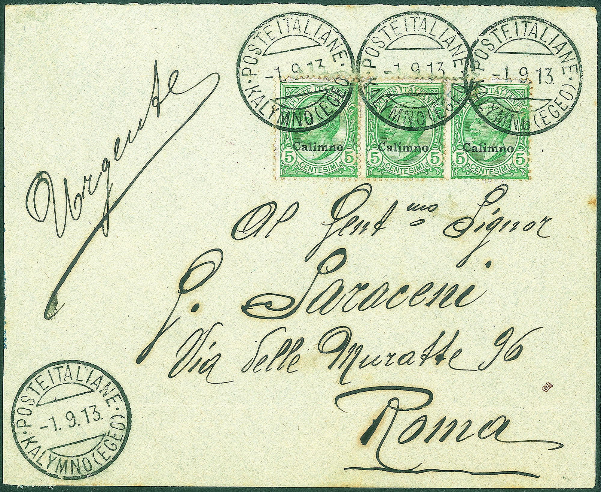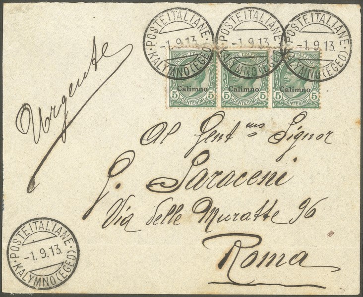 Colonie - Egeo - Kalymno (Egeo)/Poste Italiane 1.9.13 - striscia di tre del 5 cent soprastampato (2)