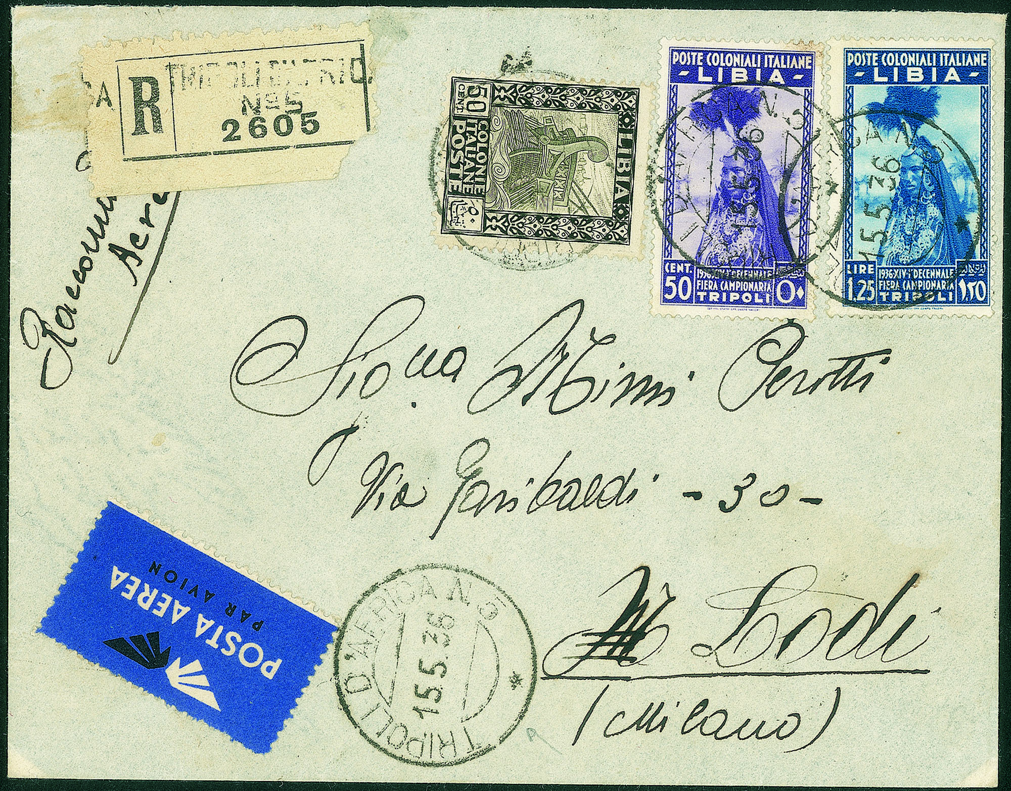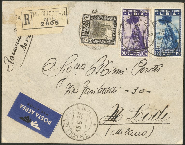 + 50 cent Pittorica (64) su busta da Tripoli a Lodi del 15.5.36