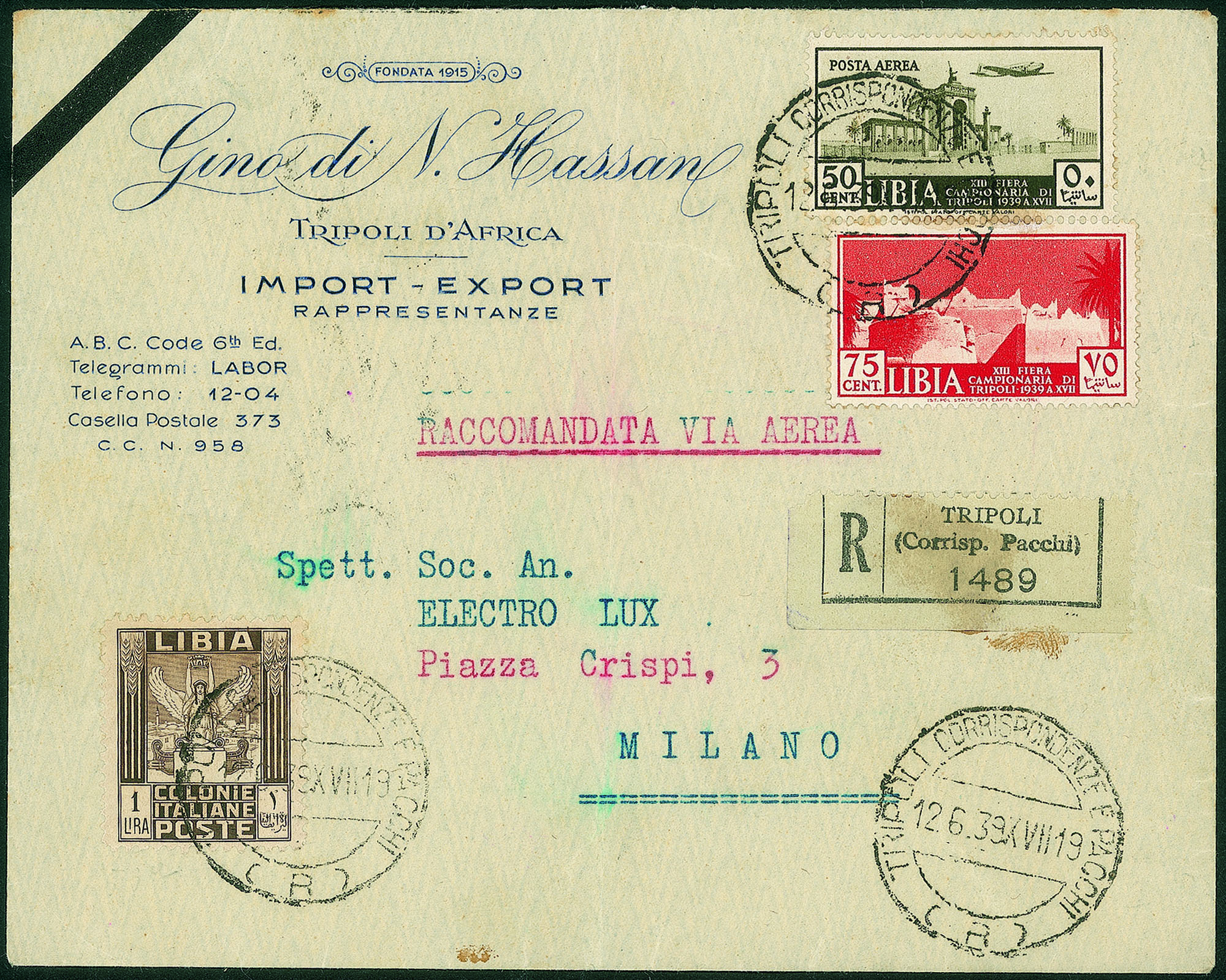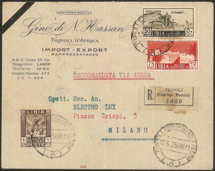 Su aerogramma raccomandato da Tripoli a Milano del 12.6.39 - in tariffa