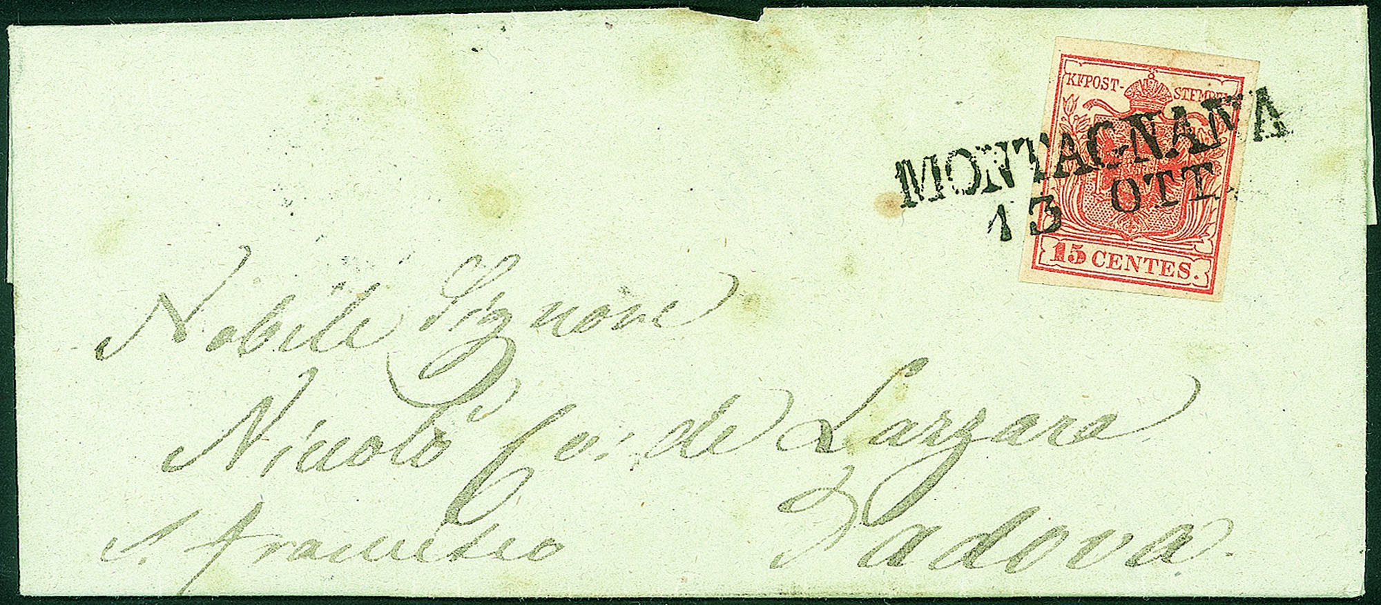 Lettera del 13.10.1850 per Padova affrancata con 15 cent primo tipo carta a mano (3)