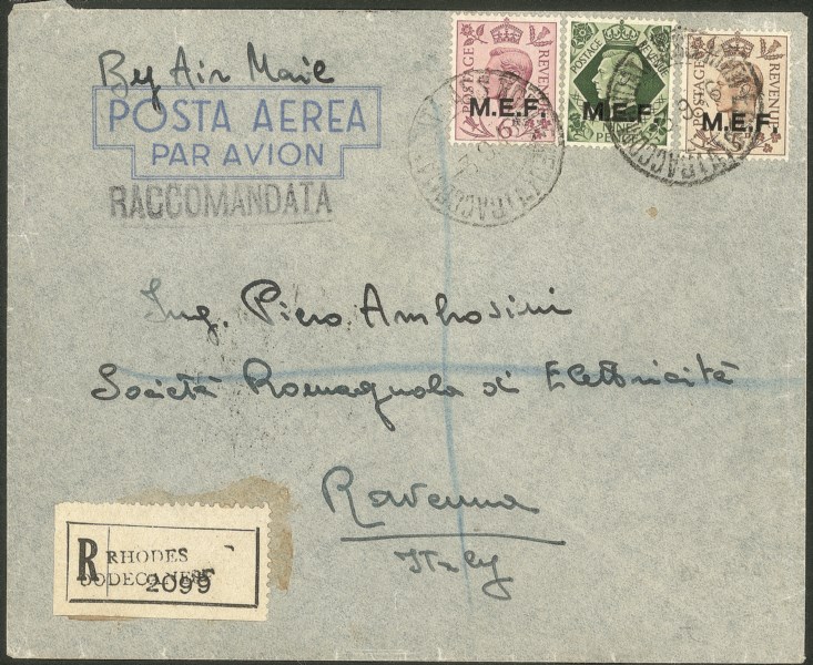 Occupazioni straniere delle colonie - Occupazione Britannica - M.E.F. - Aerogramma raccomandato con affrancatura tricolore con 5 + 6 + 9 pence (10/12)