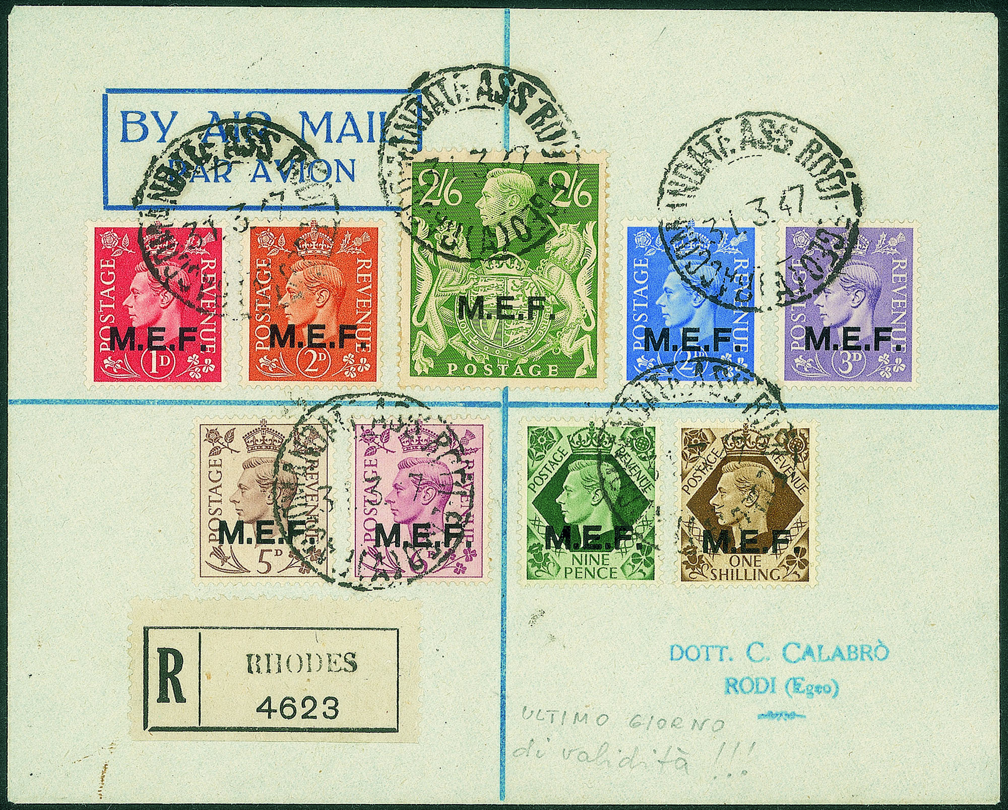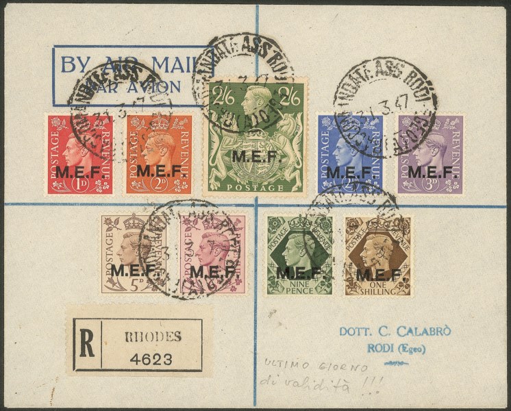 Occupazioni straniere delle colonie - Occupazione Britannica - M.E.F. - Raccomandata affrancata con 9 valori soprastampati MEF (6/14)