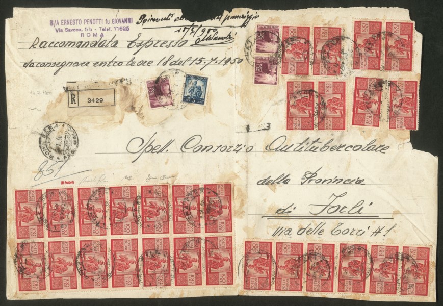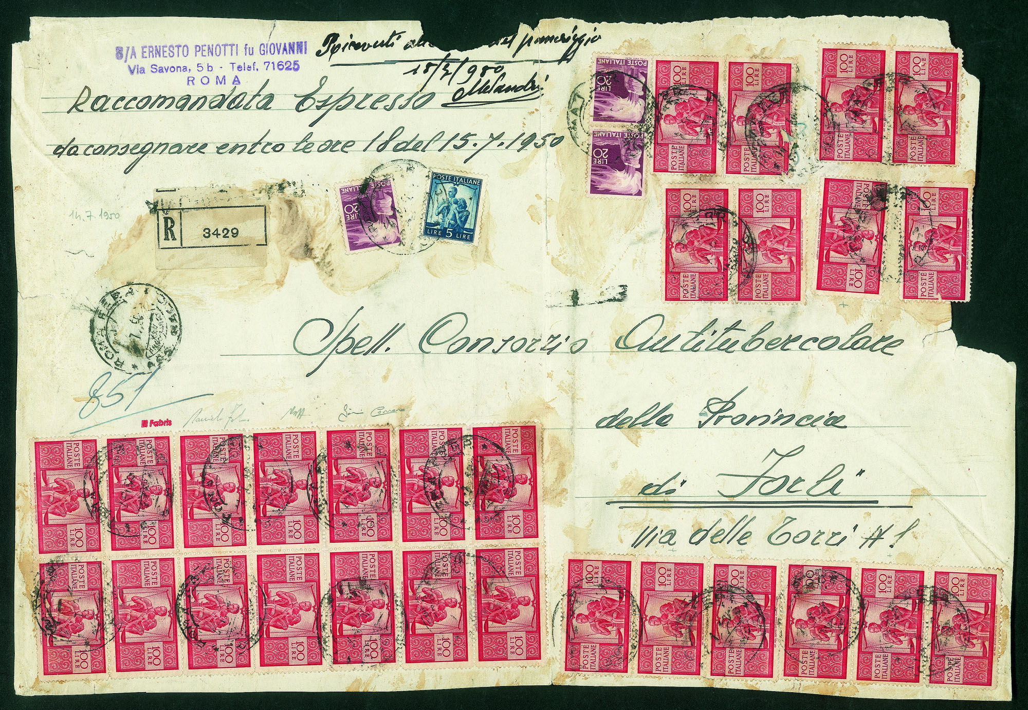 Da Roma a Forlì del 14.7.50 - si tratta della più alta affrancatura per l'interno nota con il 100 lire (riprodotta nel volume Carraro/Sirotti - Carraro + cert. Caffaz + cert. oro Fabris