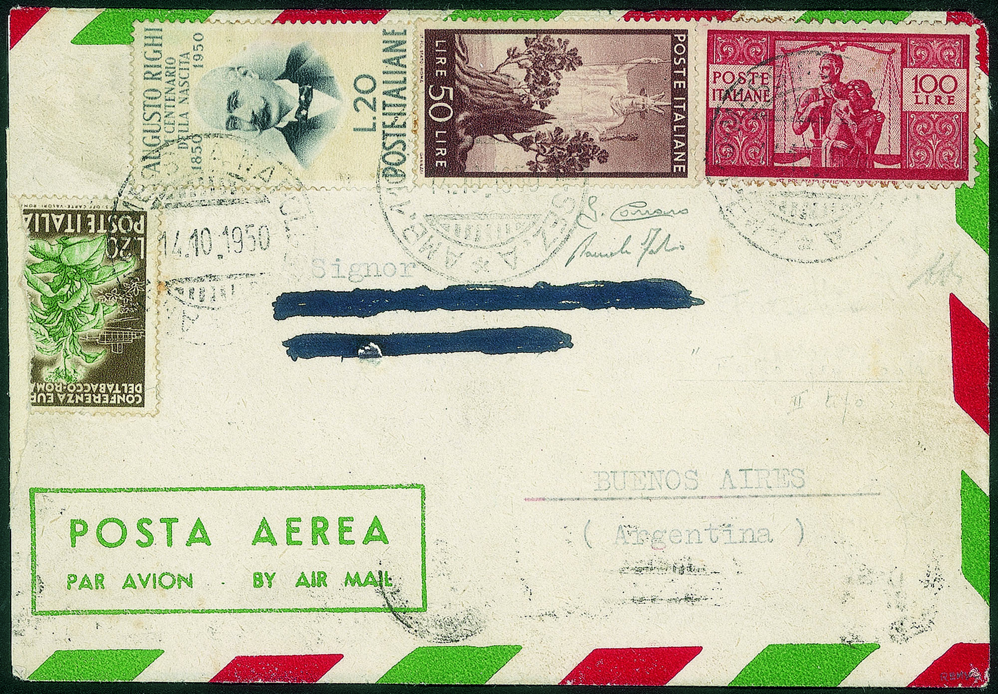 + complementari (564 + 630 difettoso + 633) da Napoli a Buenos Aires del 14.10.50 - molto rara avvalorata dalla spedizione in tariffa - di pregio e di grande valore storico postale - cert. Carraro + cert. oro Fabris