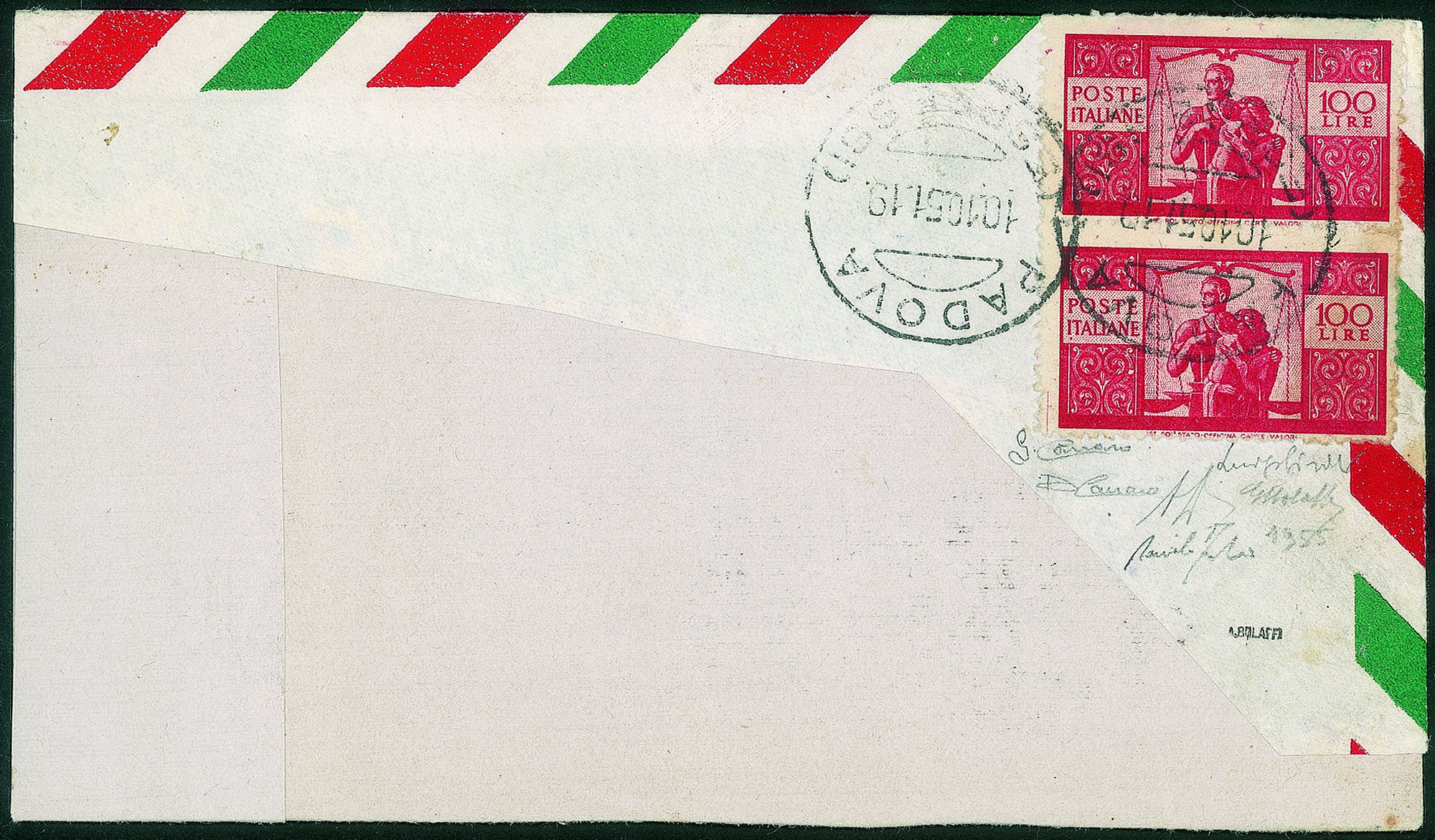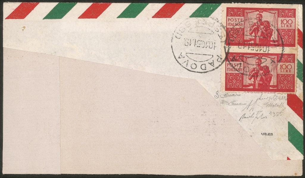 Da Padova a Buenos Aires del 10.10.51 - molto rara e malgrado la lacerazione sul fronte dovuta al fatto che il destinatario fosse il falsario stesso resta di grande pregio e di grande valore storico filatelico - cert. A. Diena + cert. G. Bolaffi + cert. Carraro + cert. oro Fabris -