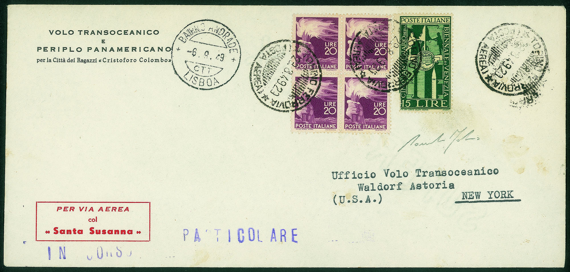 Italia - Repubblica - Aerogramma del Volo Torino Lisbona (New York) poi interrotto in Atlantico - busta del volo affrancata con quartina del 20 lire Democratica (561)