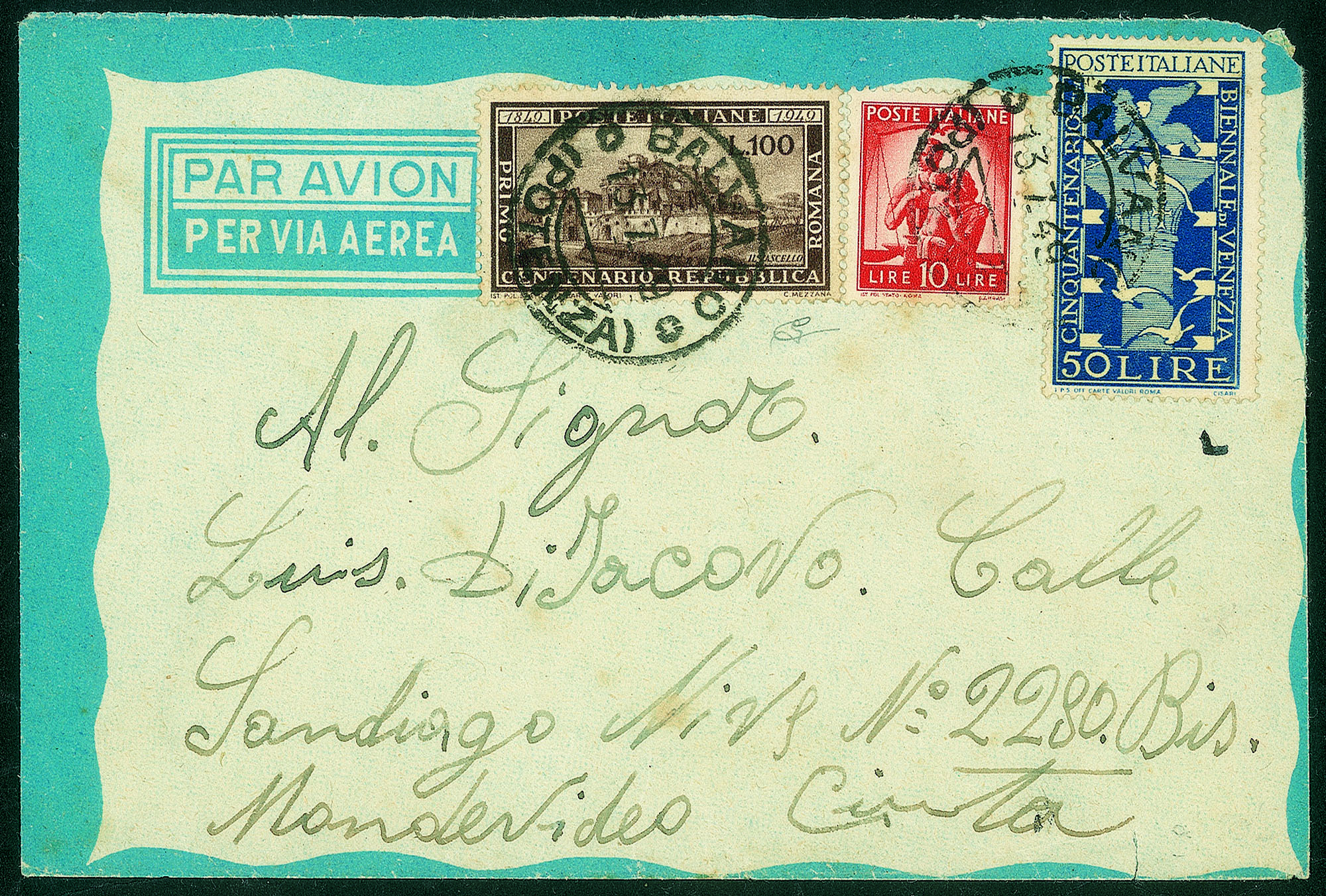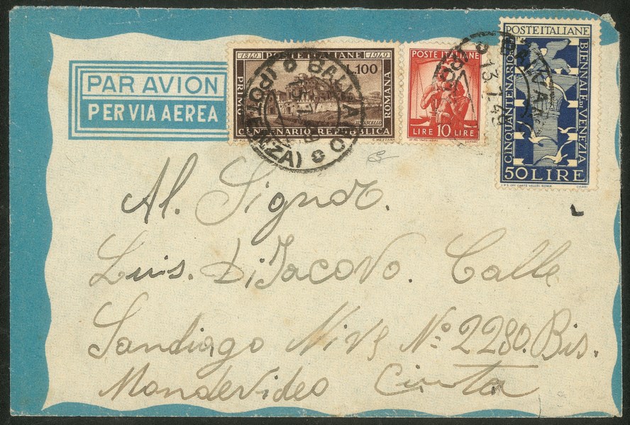 Su aerogramma da Balvano a Montevideo del 13.7.49 - molto bello e raro - cert. Carraro