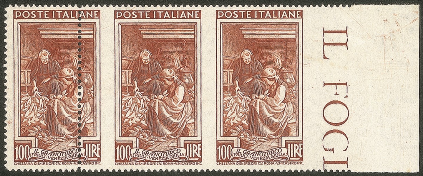 Italia - Repubblica - 1950 - 100 lire Italia al Lavoro (651naa + 651g) - striscia orizzontale di tre