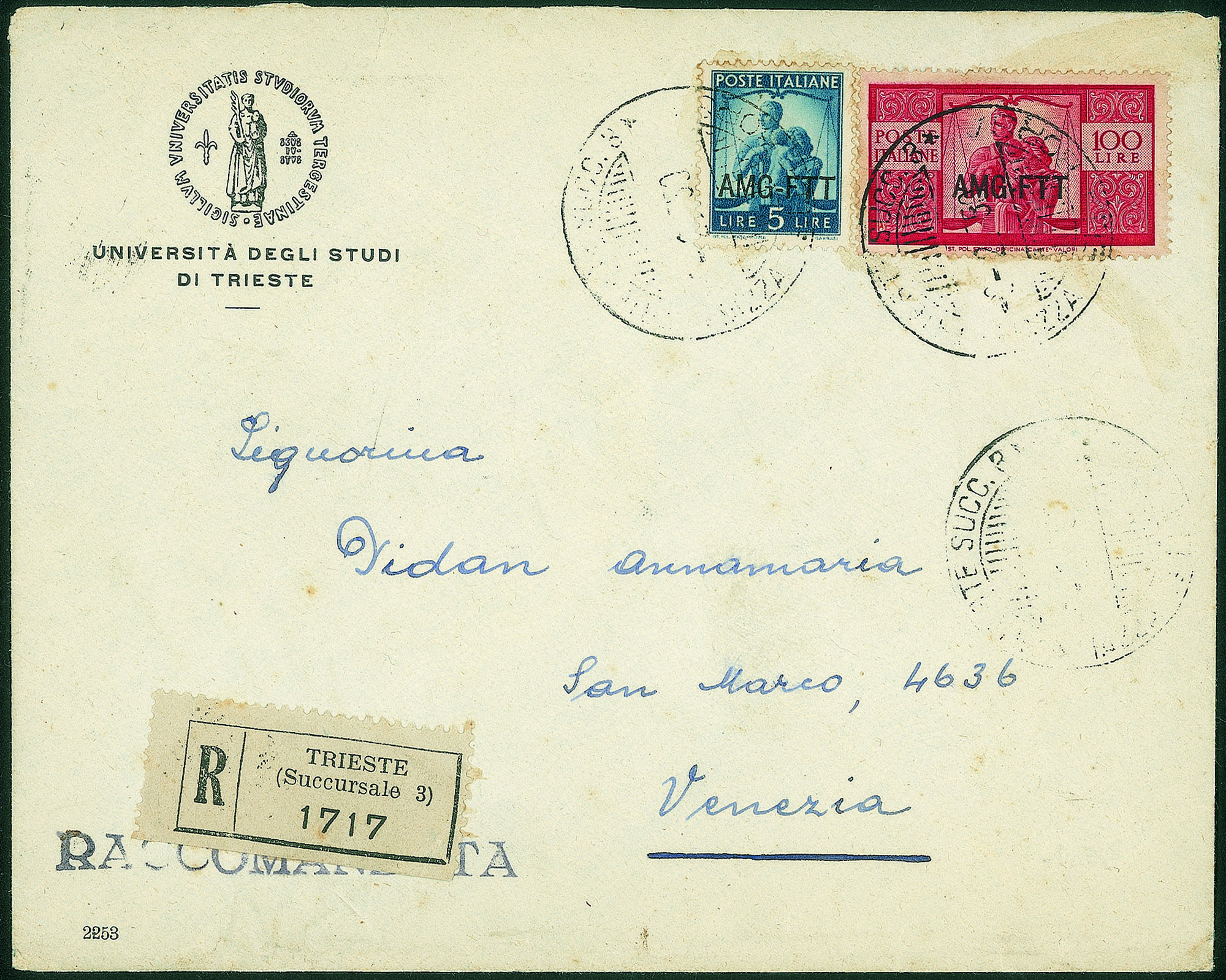 Su raccomandata da trieste a Venezia del 8.2.50 - non comune l'uso per l'interno