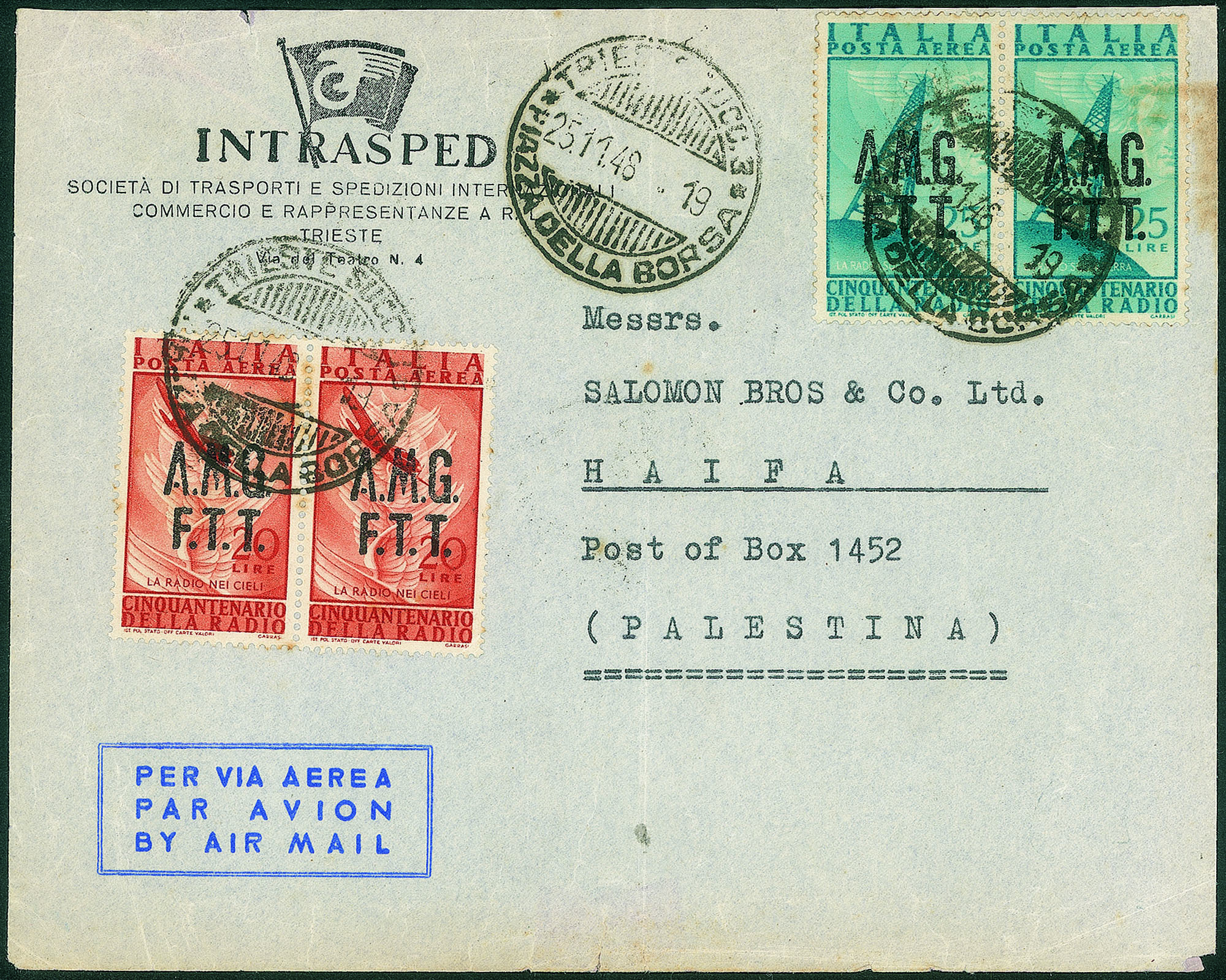 Su aerogramma da Trieste a Haifa (Palestina) del 25.11.46 - non comune destinazione