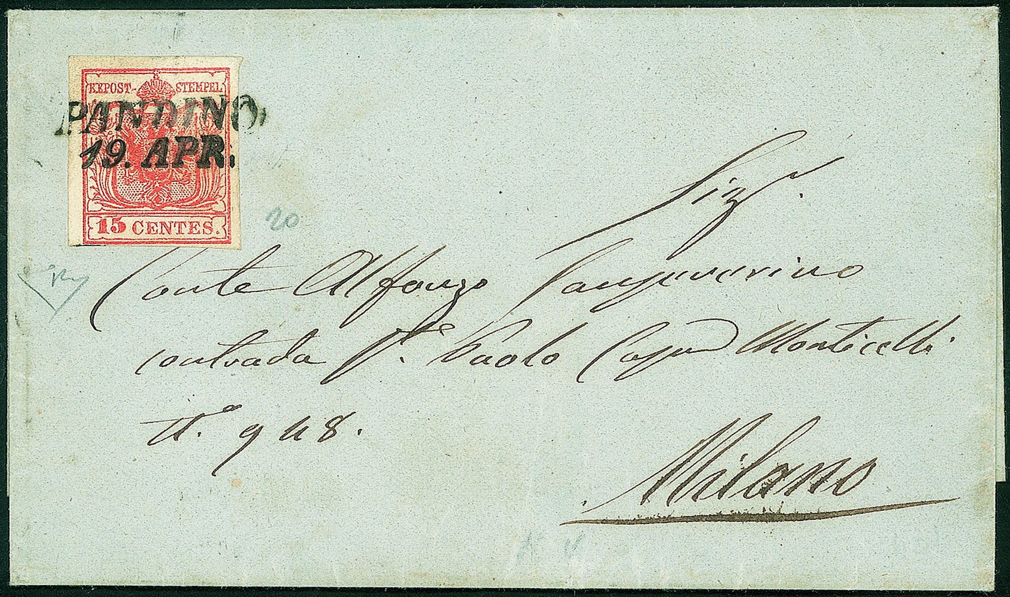 Lettera affrancata con 15 cent rosso vermiglio (20) III tipo per Milano del 19.4. - molto bella - cert. E. Diena