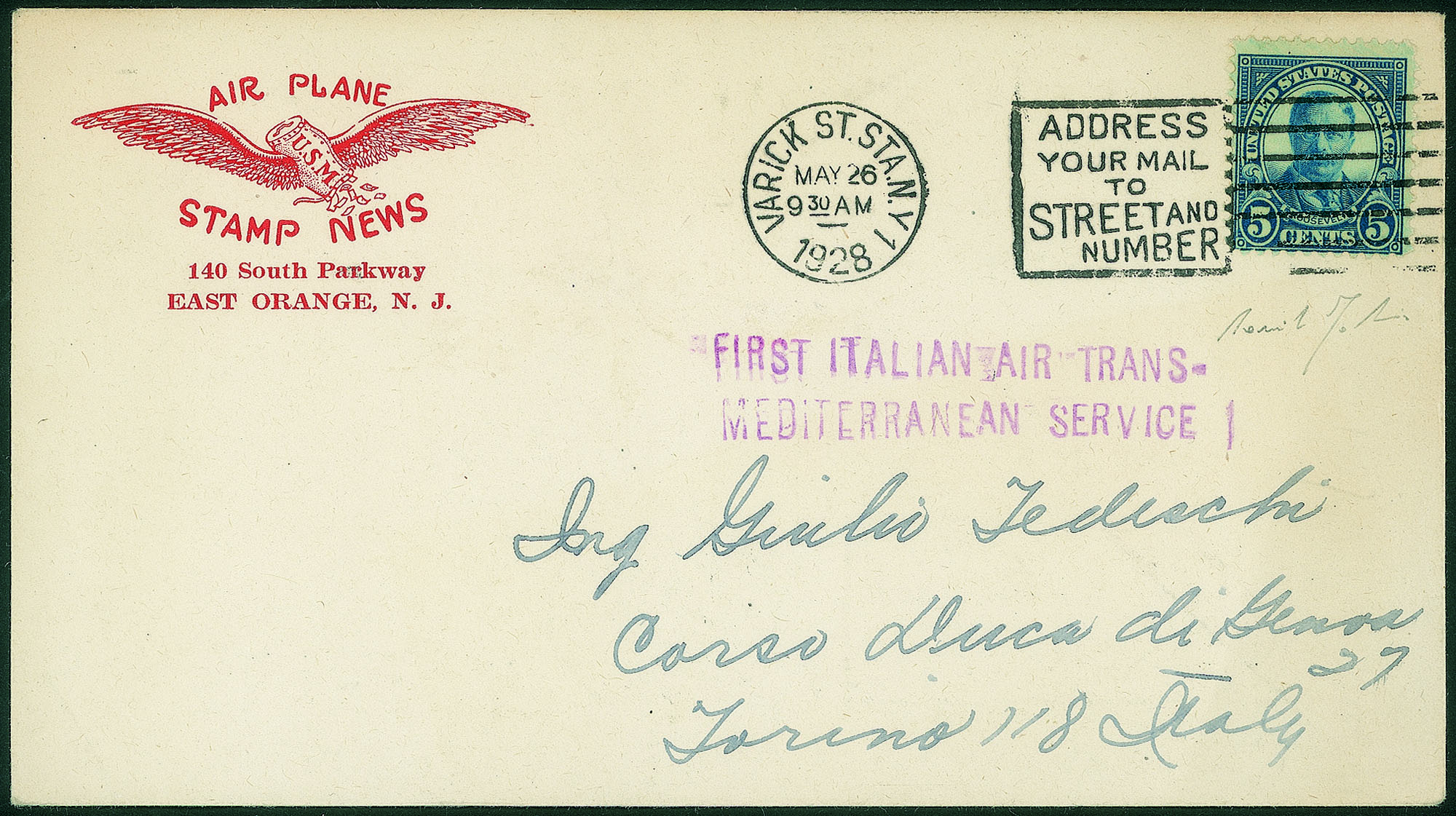 Da New York a Genova del 26.5.28 - timbro violetto 2First Italian Air Trans Mediterranean Service - cert. Fabris