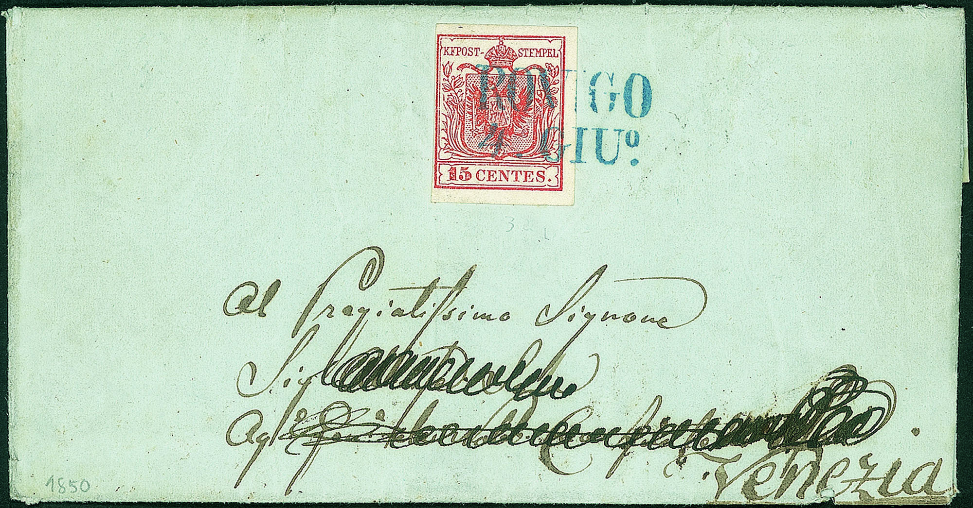 Su lettera per Venezia del 4.6.1850 (quarto giorno d'uso) - indirizzo in parte cancellato