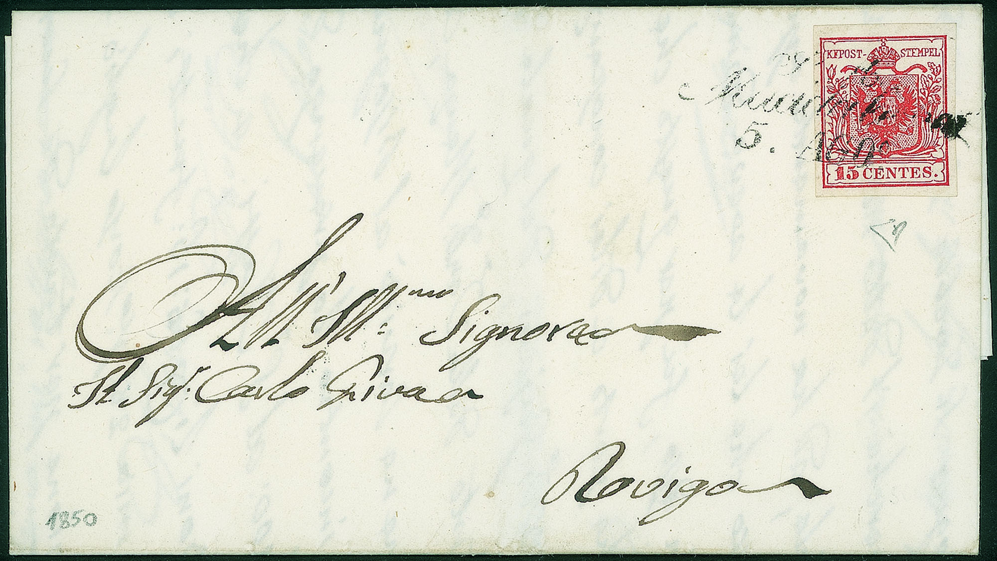 Lettera del 5.8.1850 per Rovigo affrancata con 15 cent primo tipo prima tiratura carta a mano (3a) - firma E. Diena