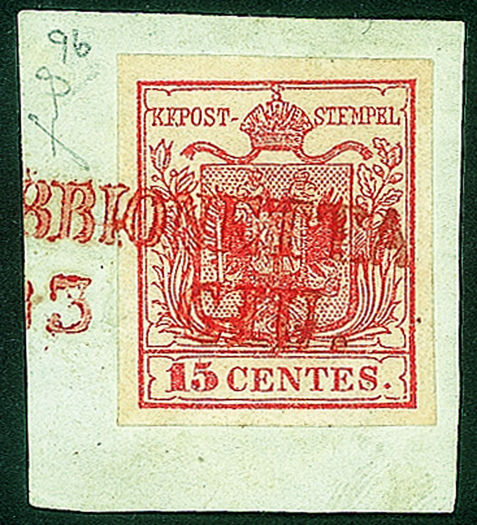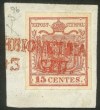 Frammento del 13.6.1850 tredicesimo giorno d'uso con 15 cent primo tipo prima tiratura carta a mano (3a) - firma Fiecchi + cert. E. Diena