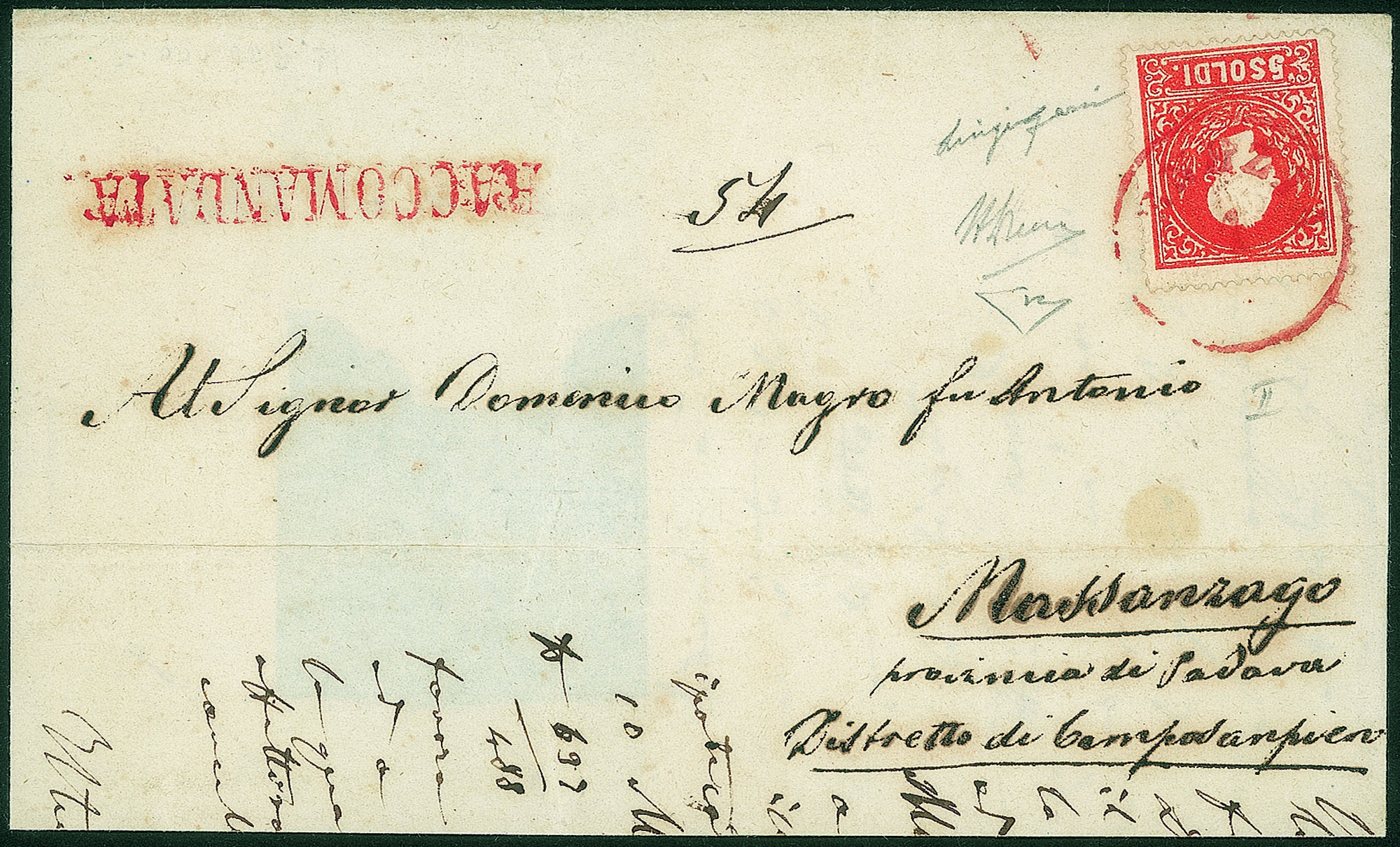 Gran parte di lettera raccomandata con s.5 rosso II tipo (30) annullato col pregevole bollo C1 in rosso - Diena segnala unicamente tre impronte note - Gazzi + A.Diena + Cert. E.Diena