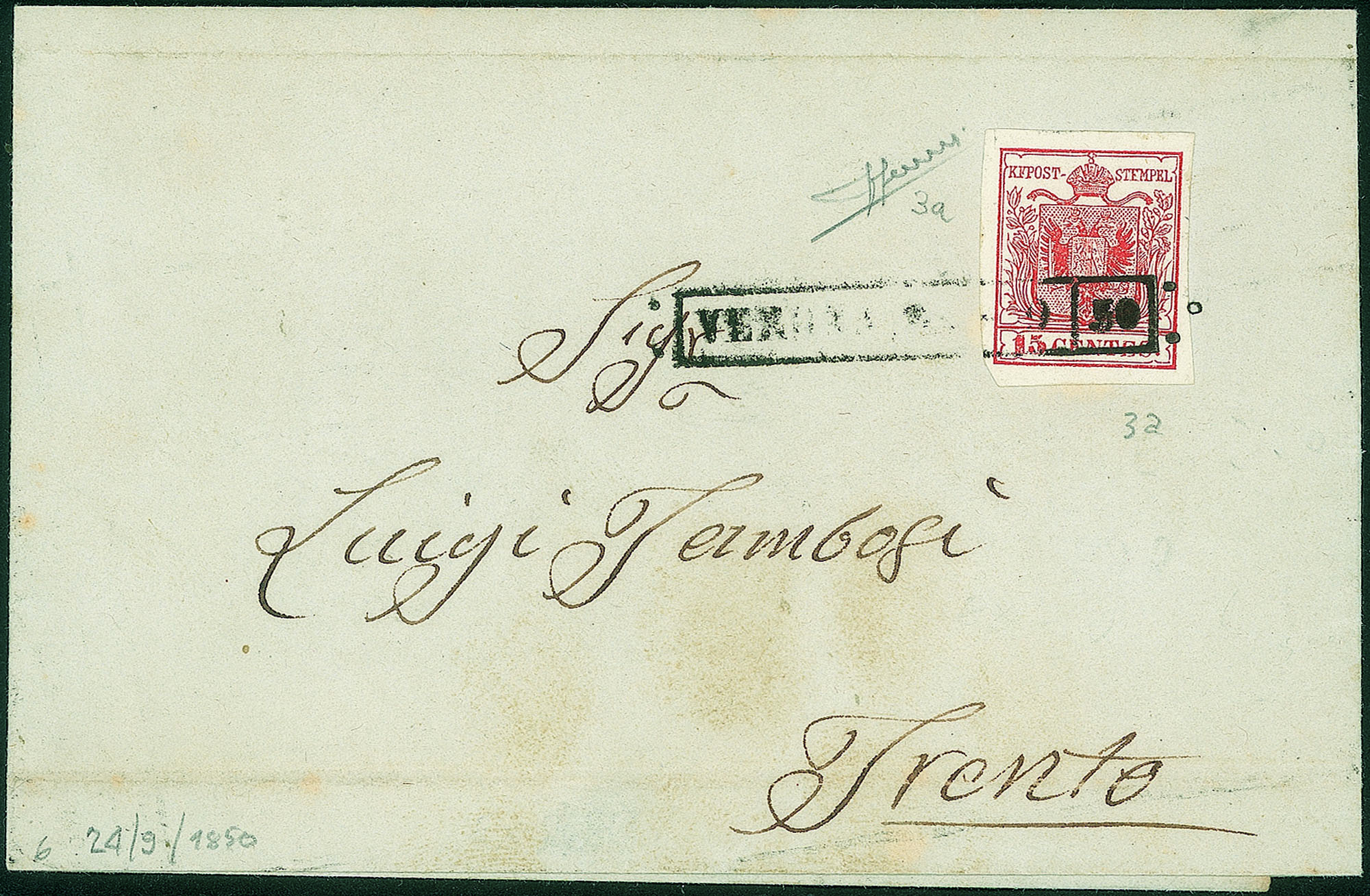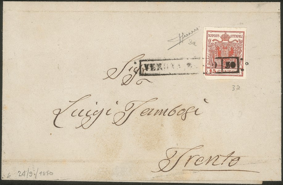 Lettera del 24.9.1850 affrancata con 15 cent primo tipo prima tiratrura carta a mano (3a) - firma Sorani