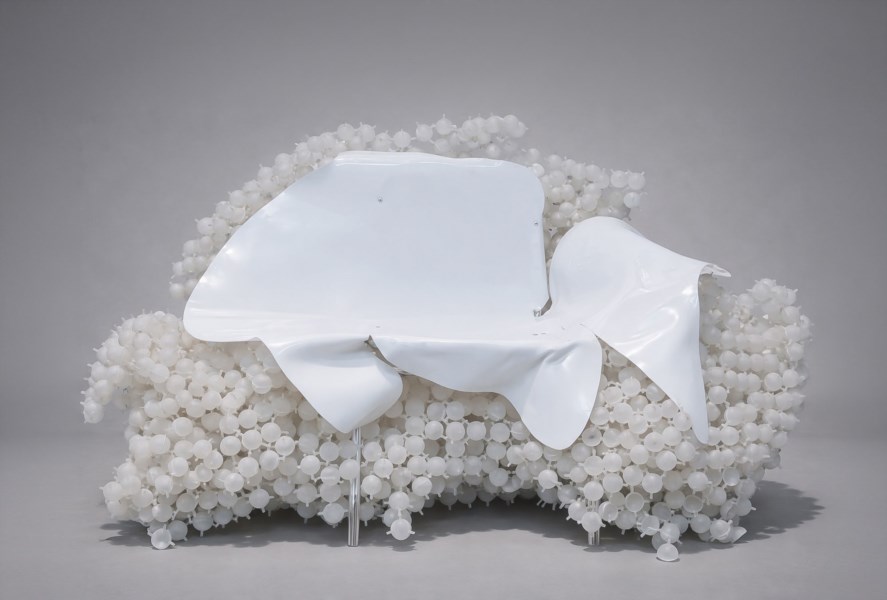 Sedia in alluminio, PETG bianco opalino, moduli in PTFE bianco, fascette di plastica