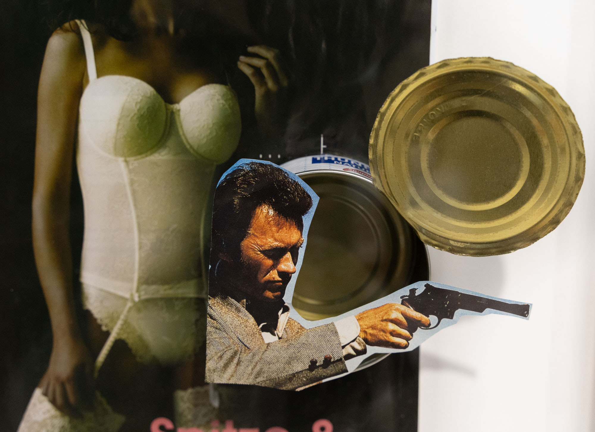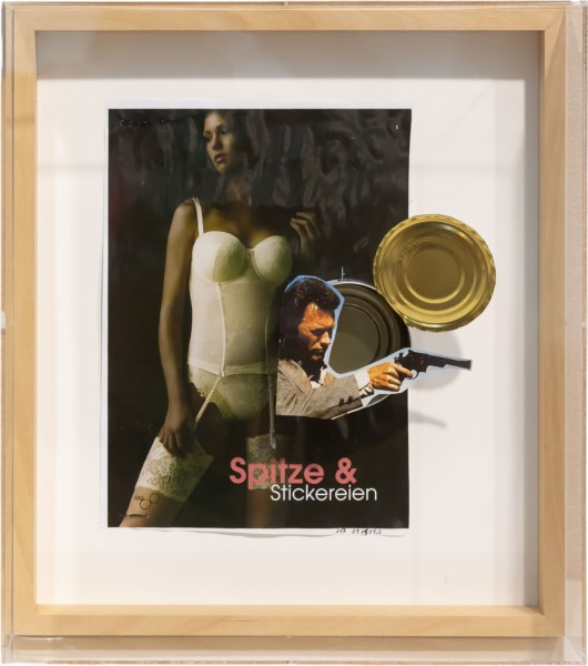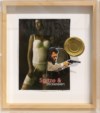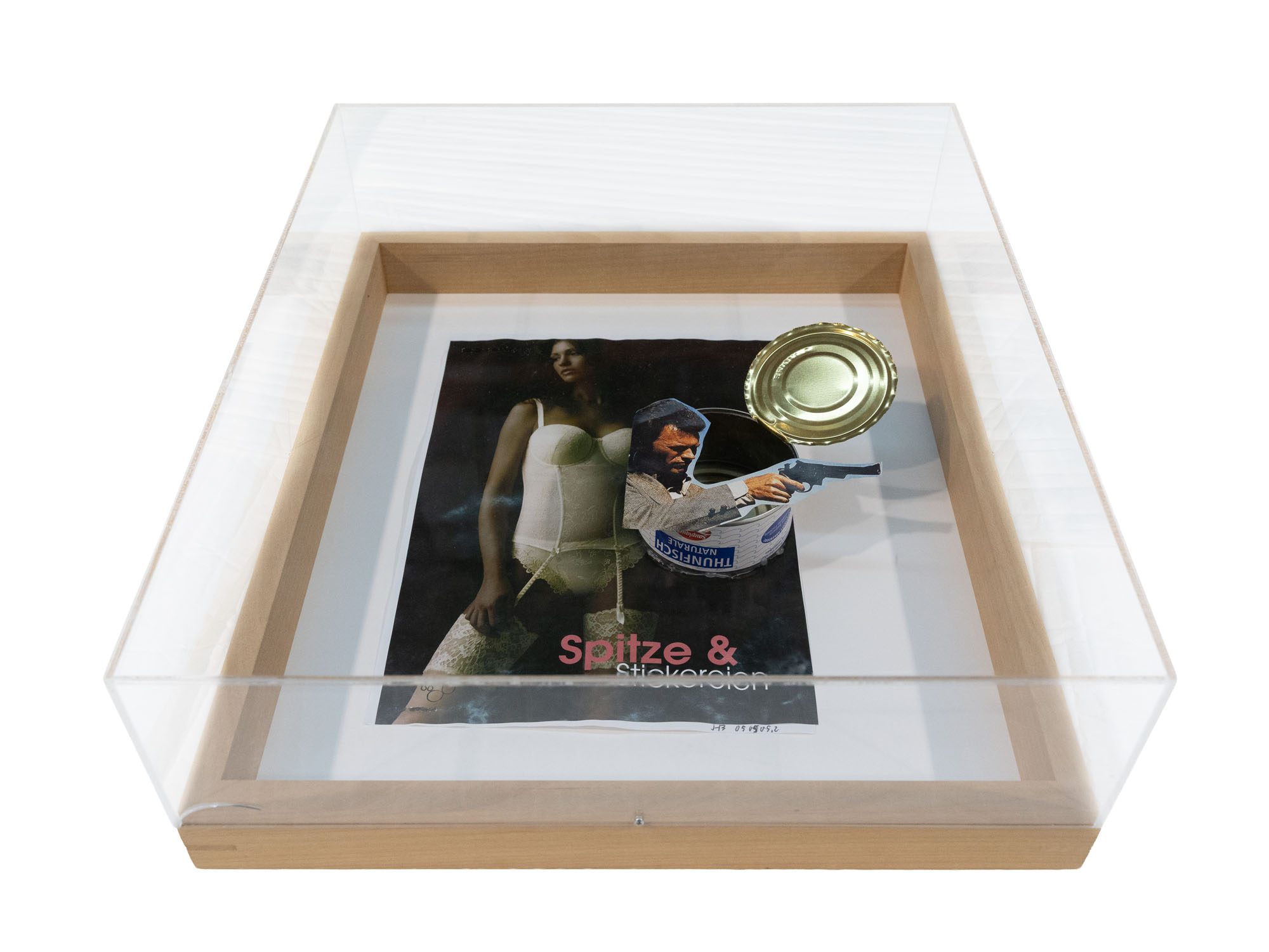 Collage e applicazioni entro teca in plexiglass