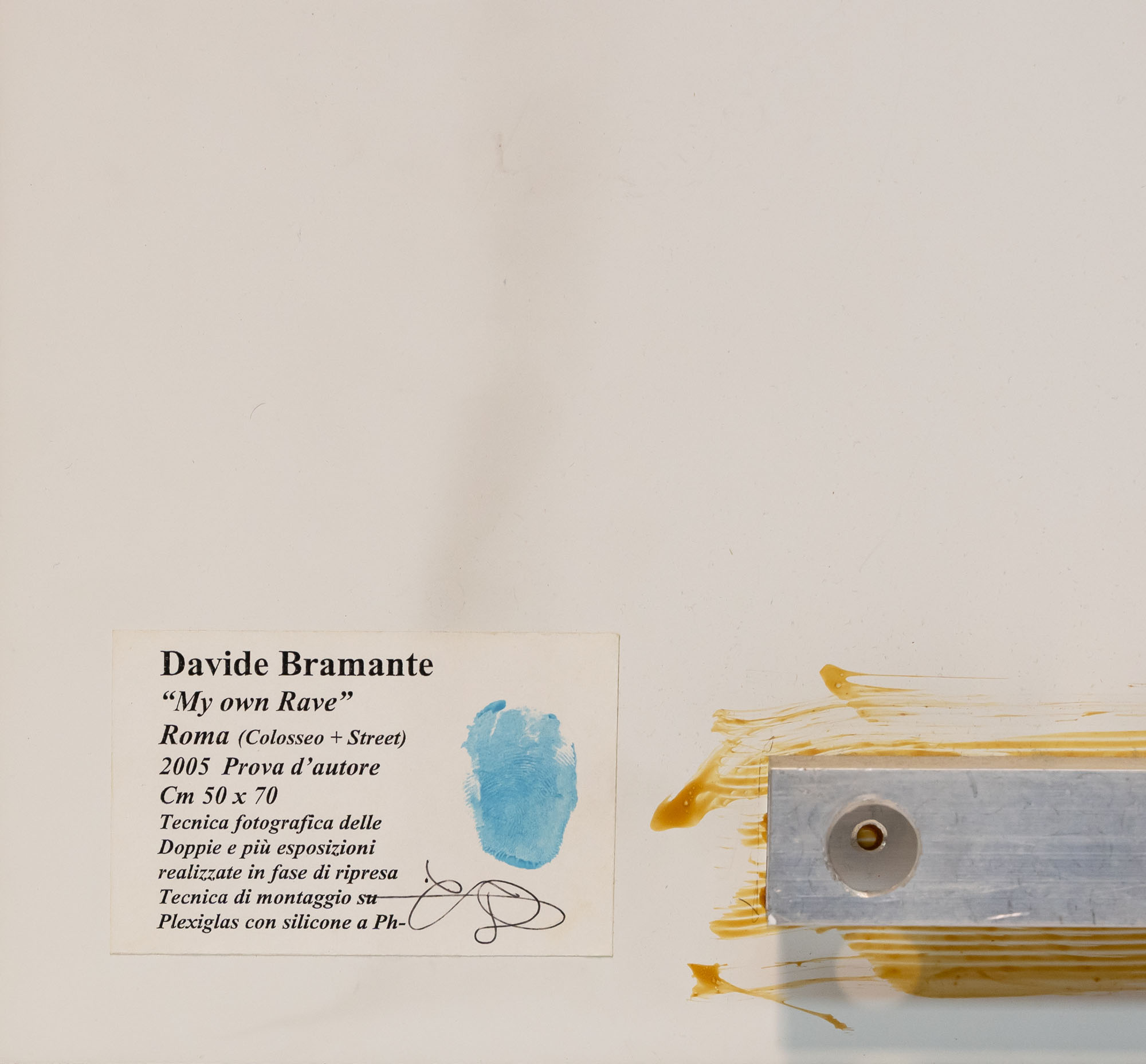 Firma e impronta del palmo della mano dell'artista su etichetta al retro